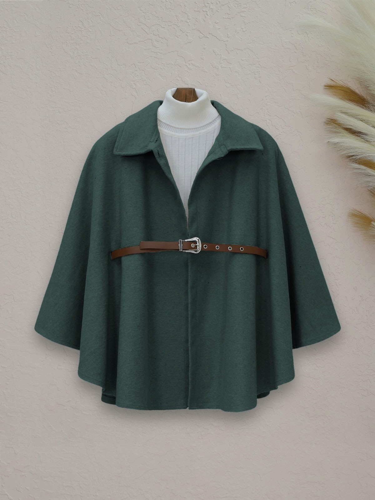 Omuzu Düğmeli Beli Kemerli Kaşe Panço -Zümrüt-Zümrüt