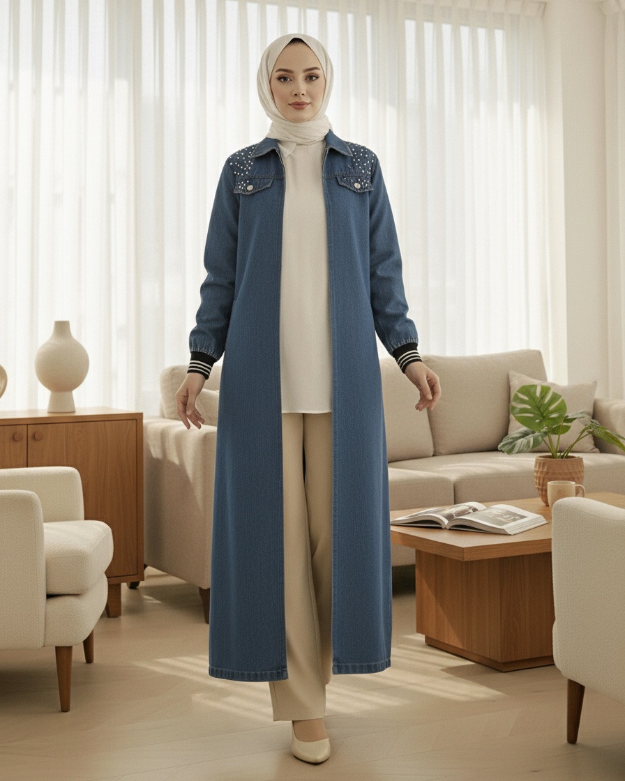Omuzu İncili Ribanalı Fermuarlı Uzun Kot Kap -İndigo-İndigo