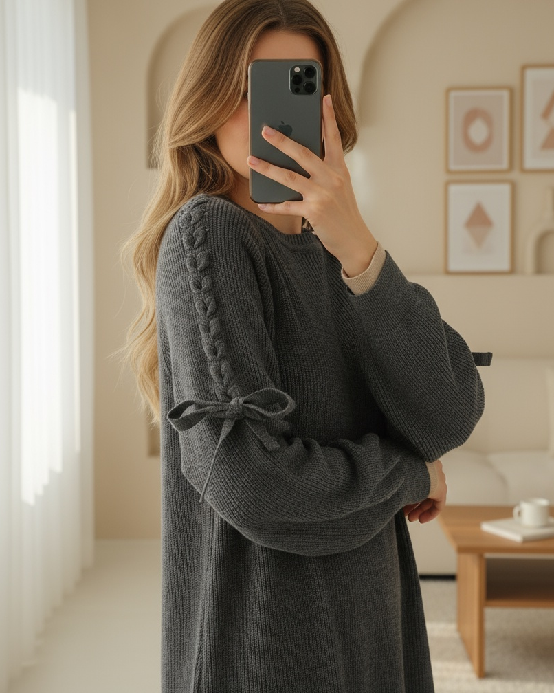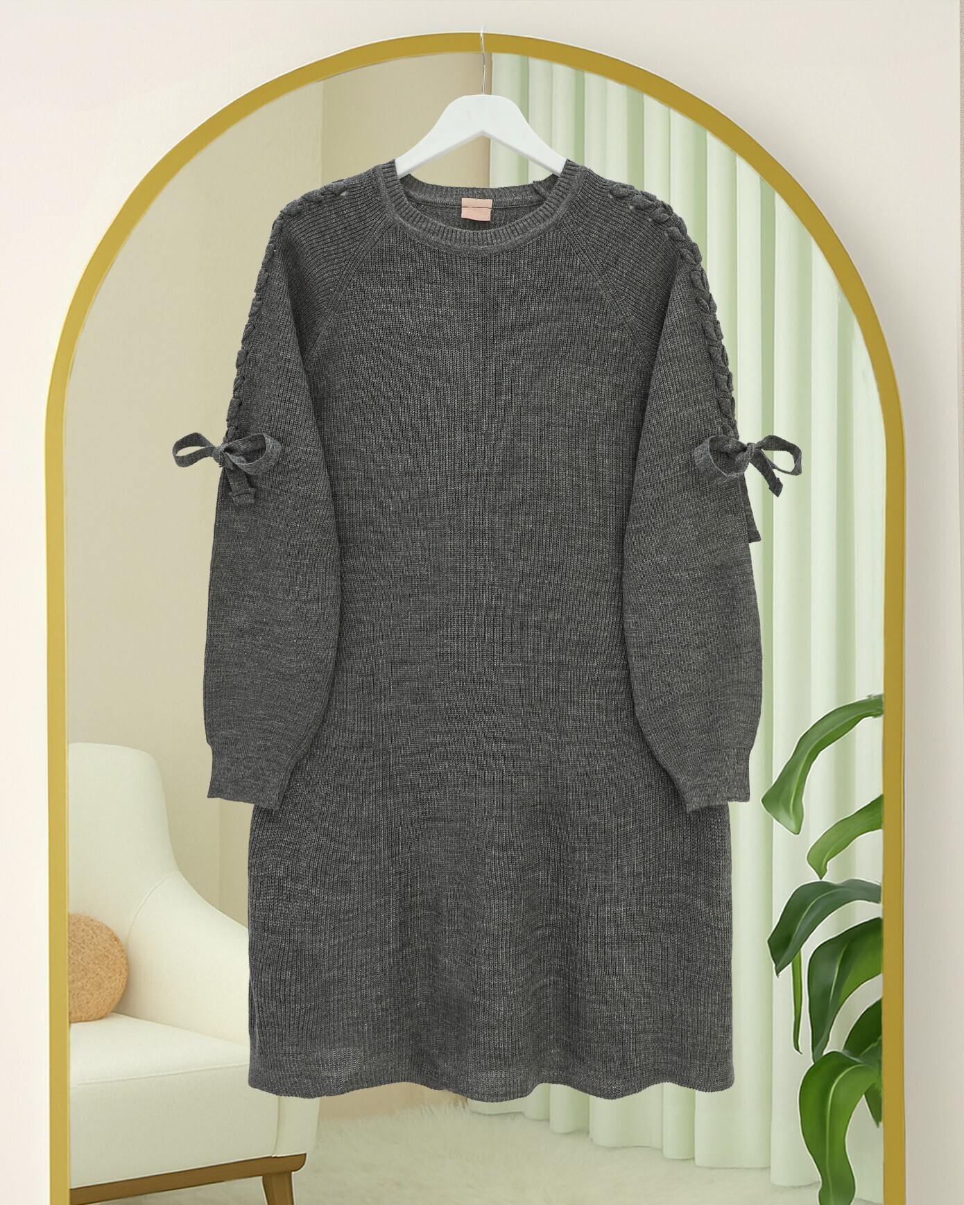 Omuzu Saç Örgülü Salaş Triko Tunik -Füme-Füme