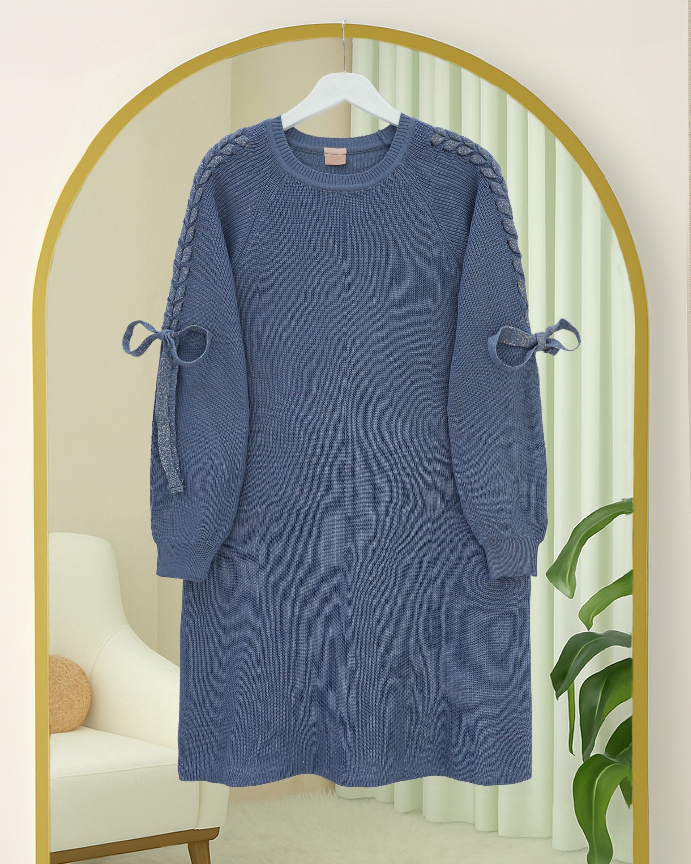 Omuzu Saç Örgülü Salaş Triko Tunik -İndigo-İndigo
