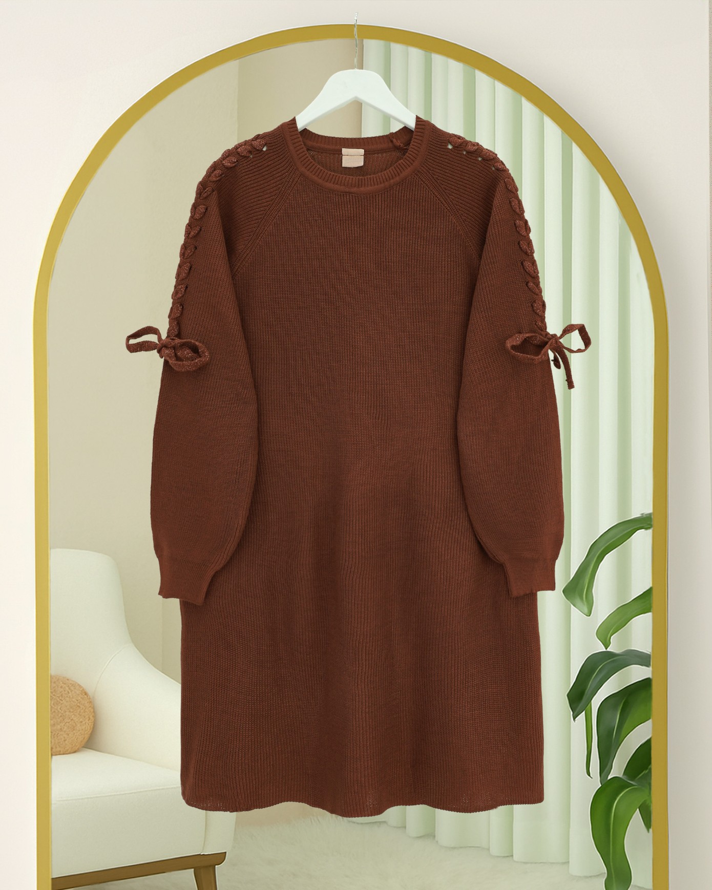Omuzu Saç Örgülü Salaş Triko Tunik -Kiremit-Kiremit