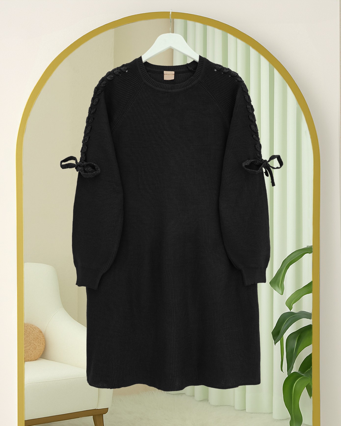 Omuzu Saç Örgülü Salaş Triko Tunik -Siyah-siyah