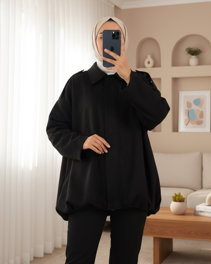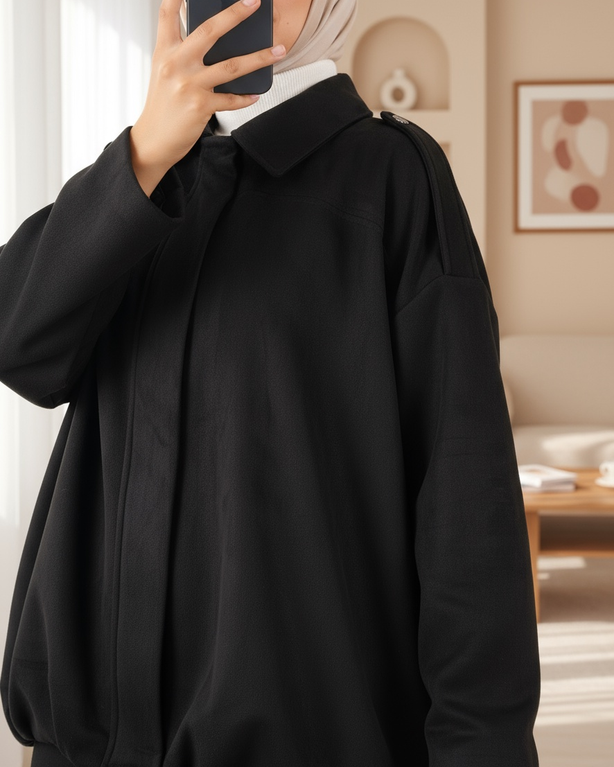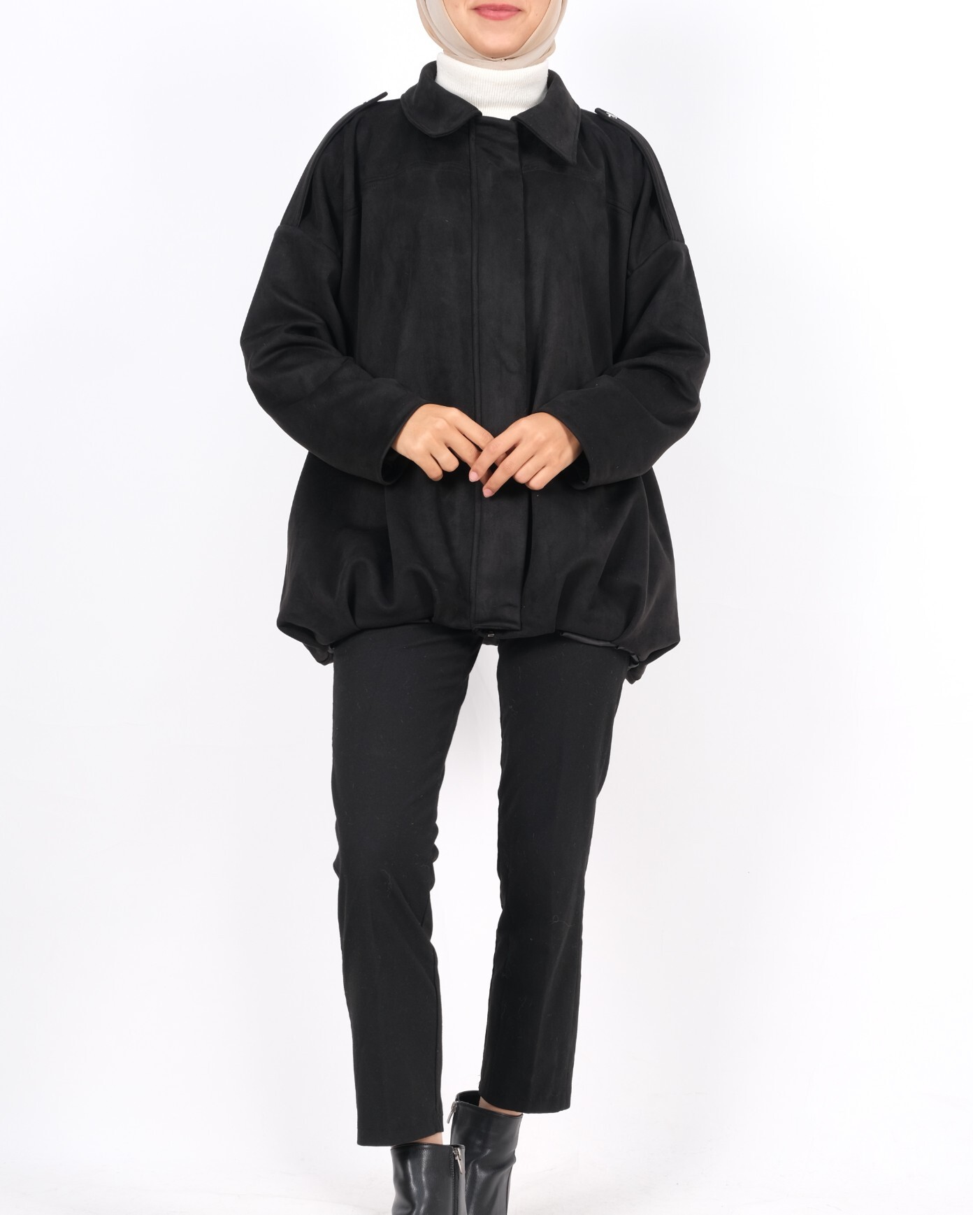Omzu Apoletli Önü Fermuarlı Astarlı Süet Ceket -Siyah-siyah