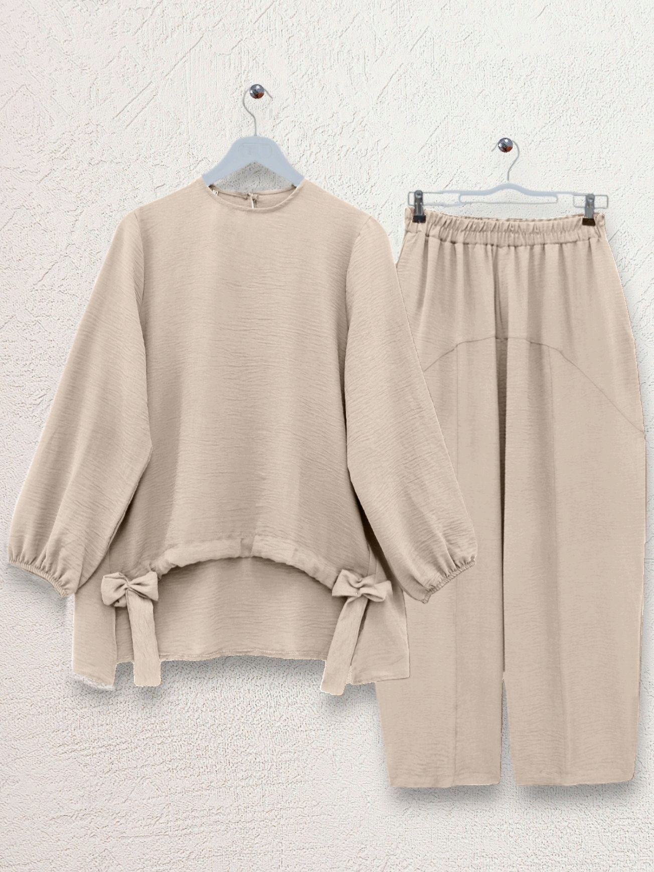 Önden Büzmeli Şalvar Pantolon Ayrobin Salaş Takım -Bej-Bej