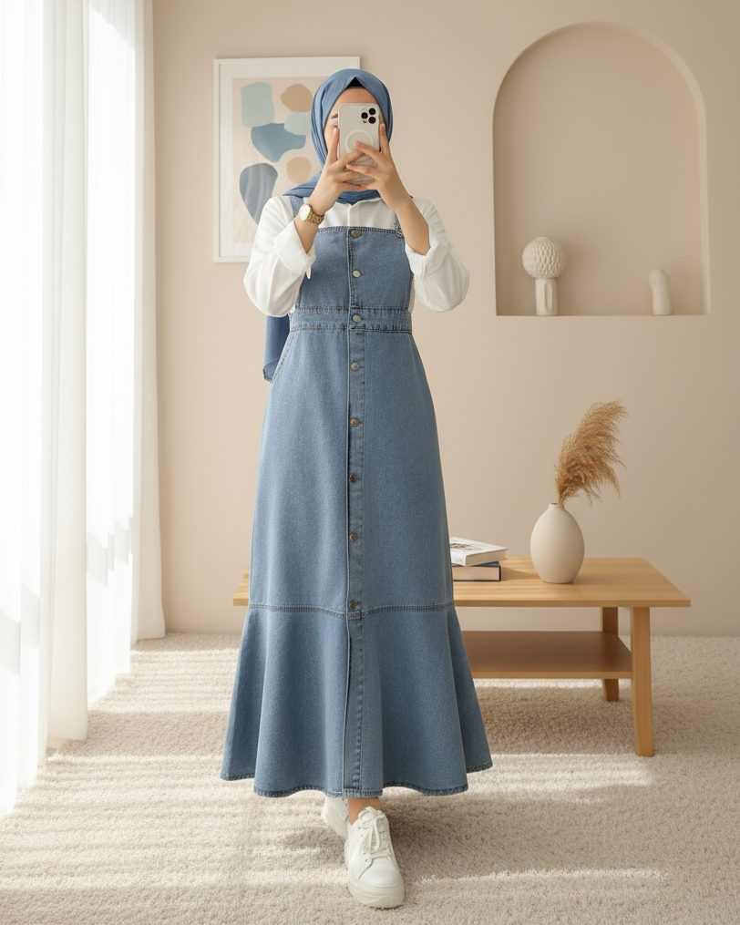 Önden Düğmeli Yan Cepli Eteği Fırfırlı Kot Jile -Buz Mavi-Buz Mavi