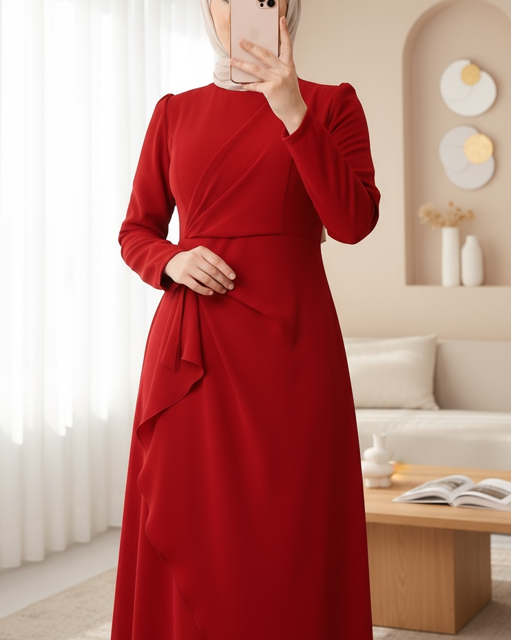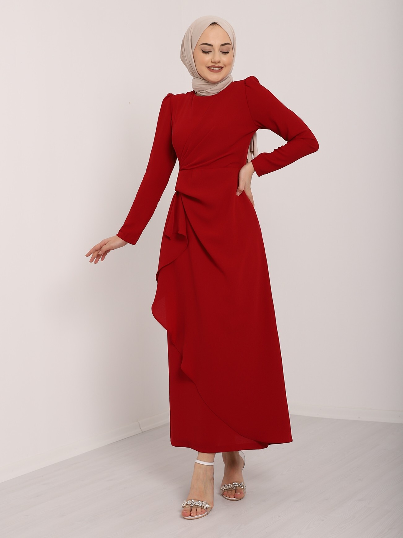 Önü Allerli Eteği Asimetrik Krep Elbise -Bordo-Bordo