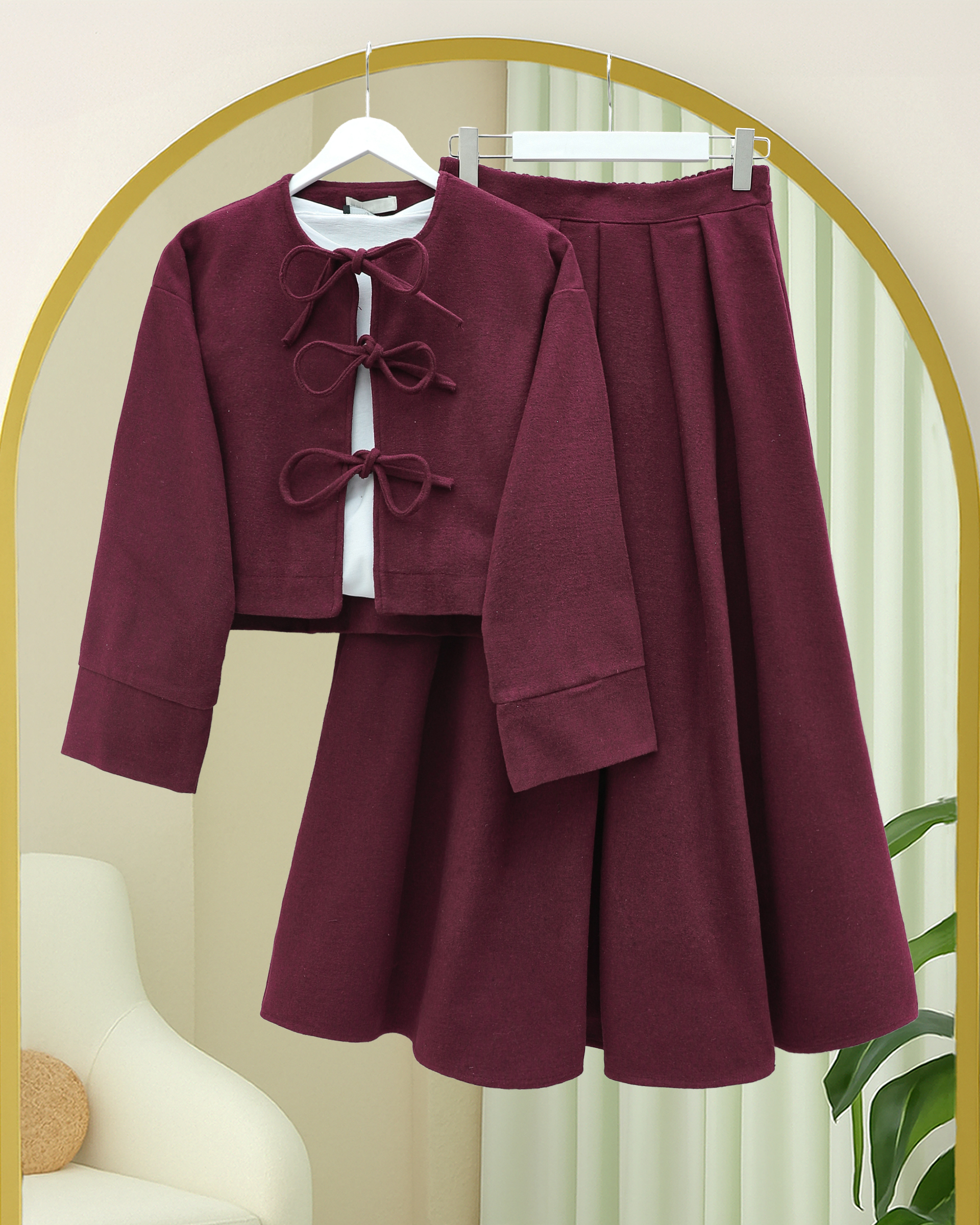 Önü Bağcıklı Etekli Kaşe Takım -Bordo-Bordo