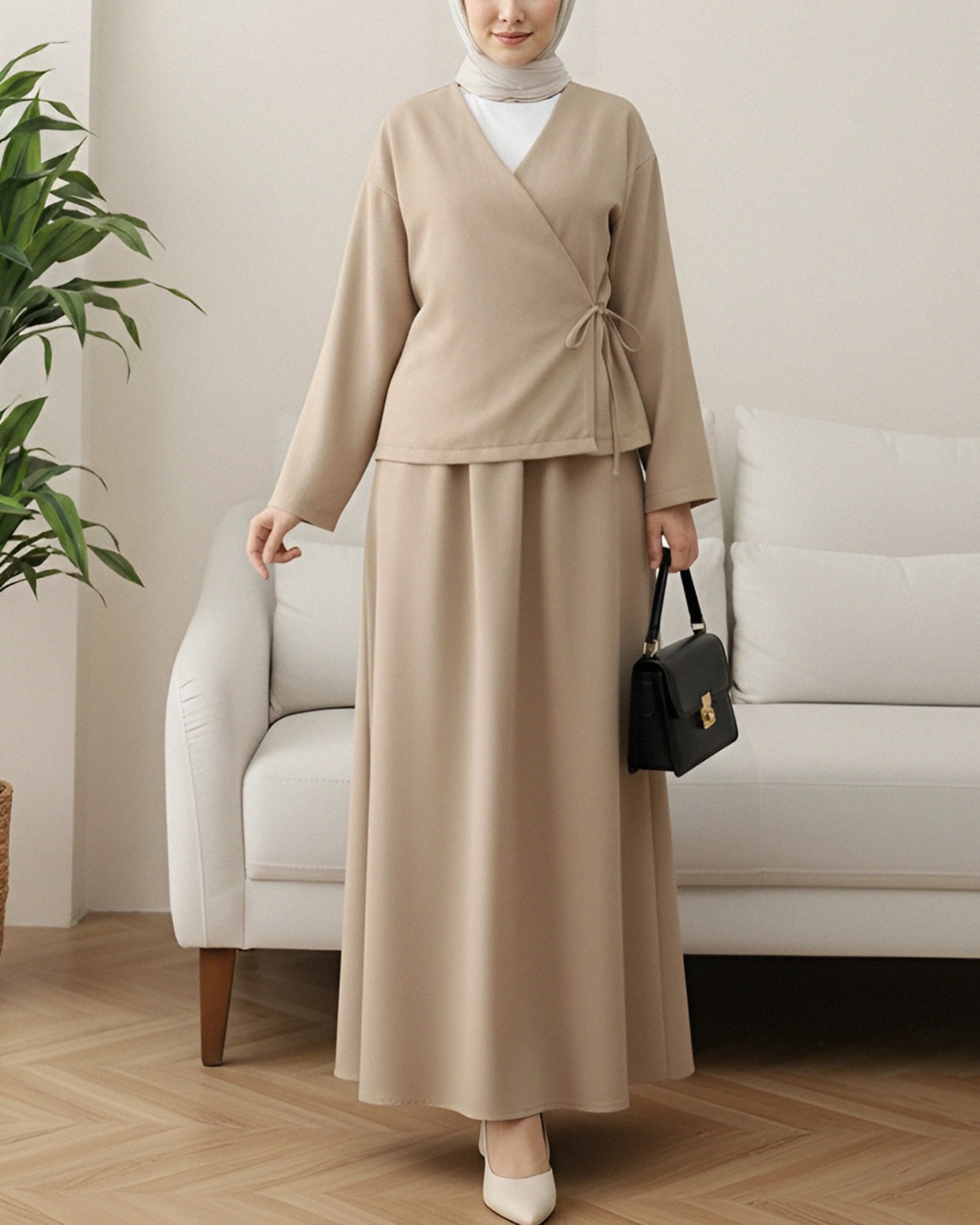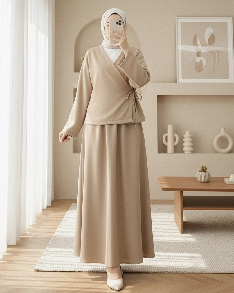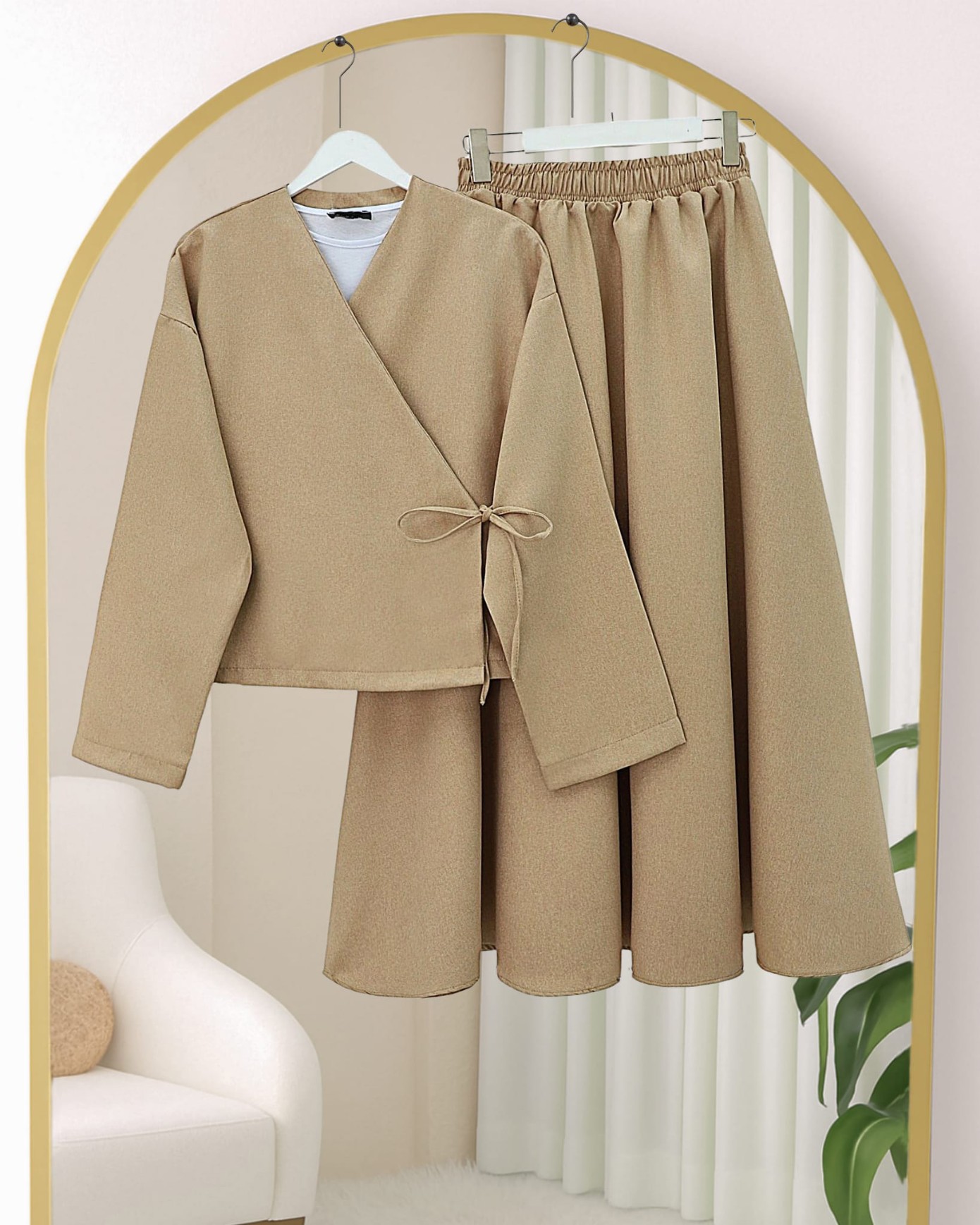 Önü Bağcıklı Etekli Yün Efekt Kışlık Takım -Vizon-Vizon