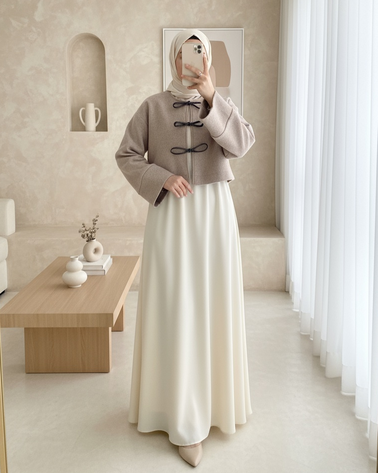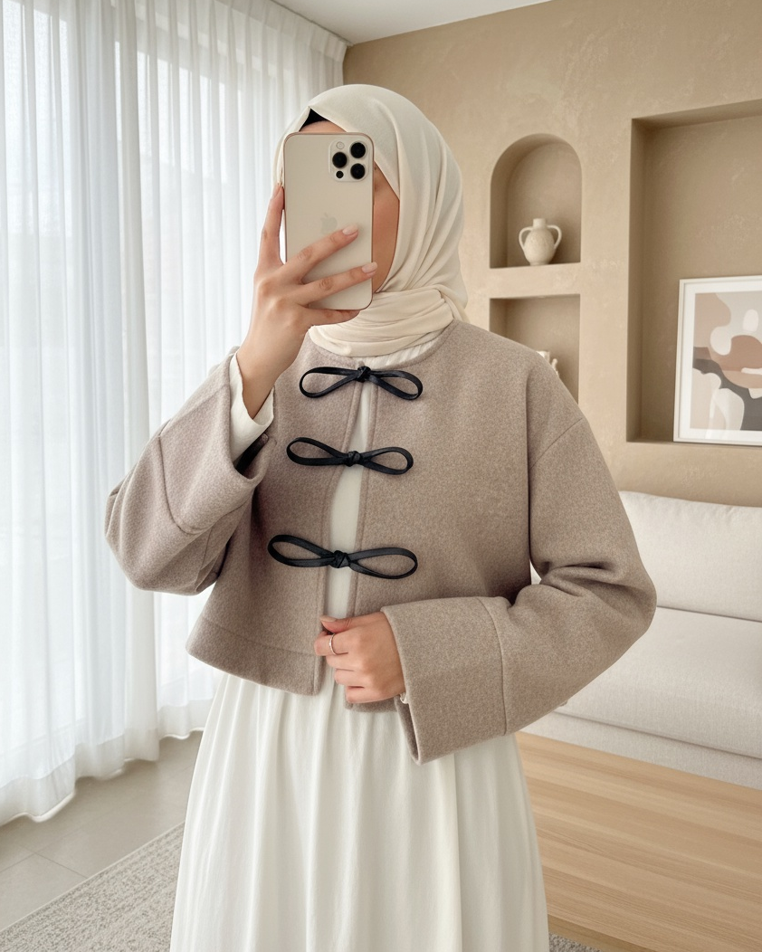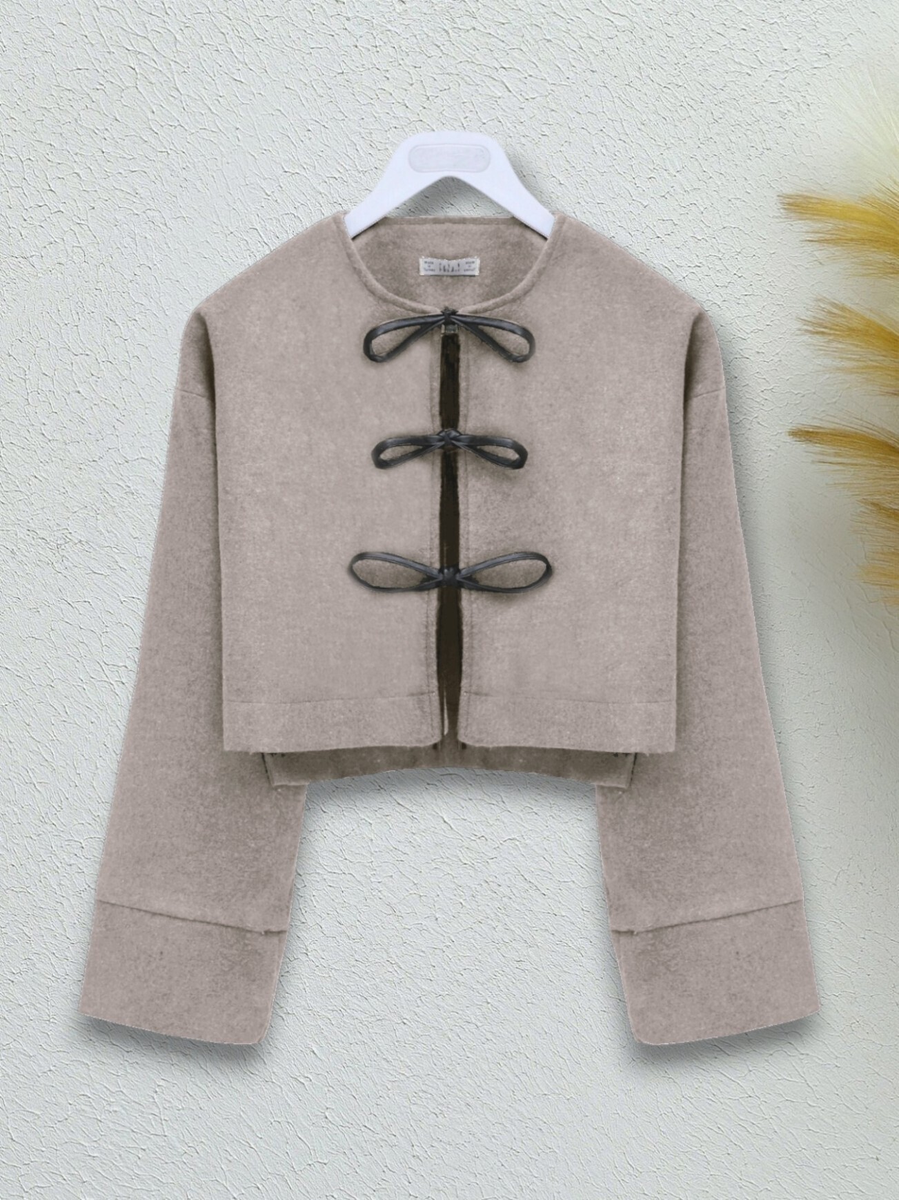 Önü Bağcıklı Kaşe Ceket -Vizon-Vizon