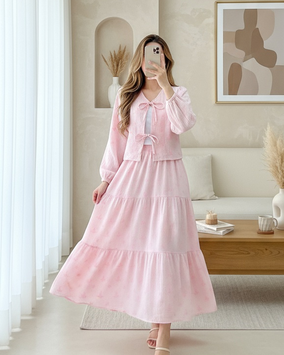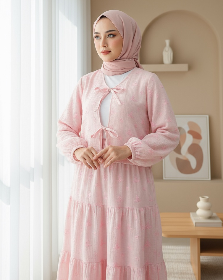 Önü Bağcıklı Nakış Detaylı Etekli Müslin Takım -Pudra-Pudra