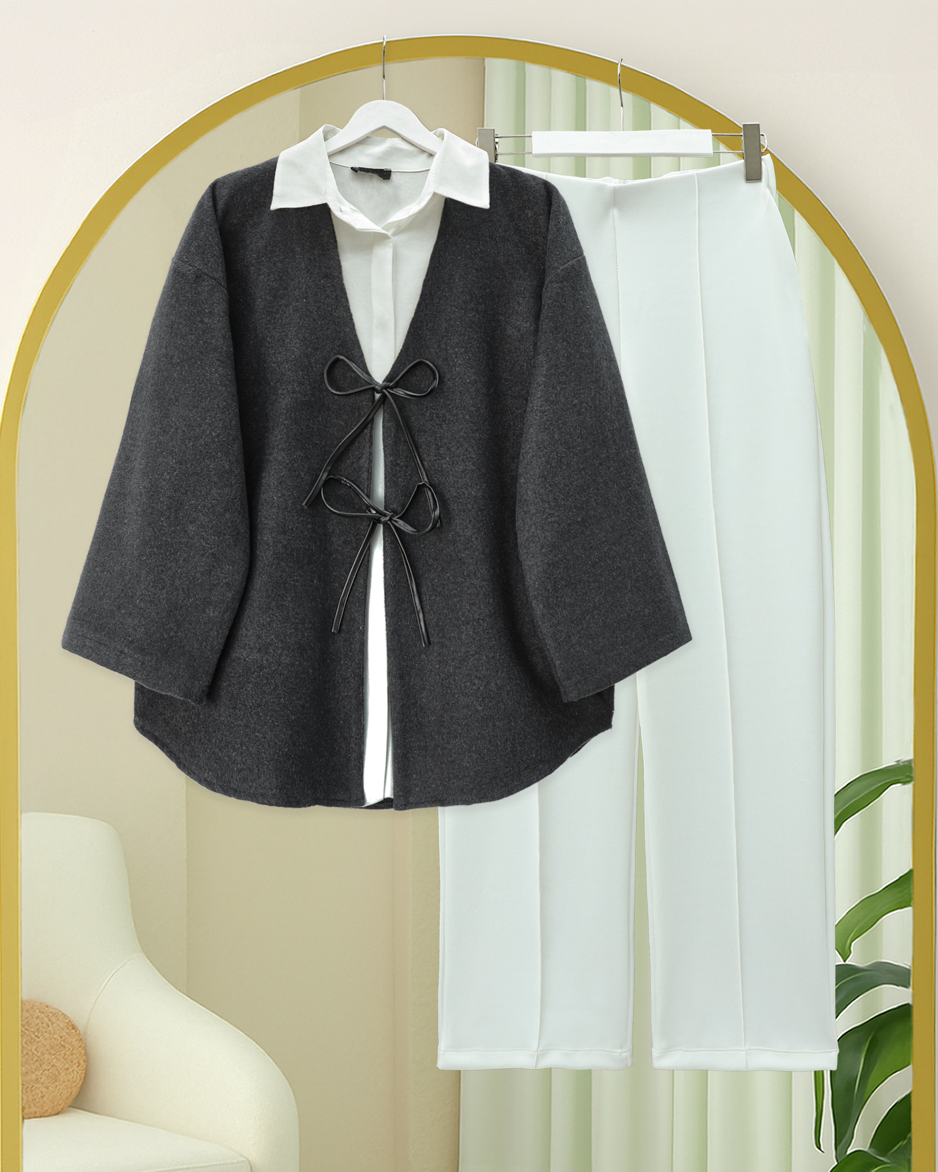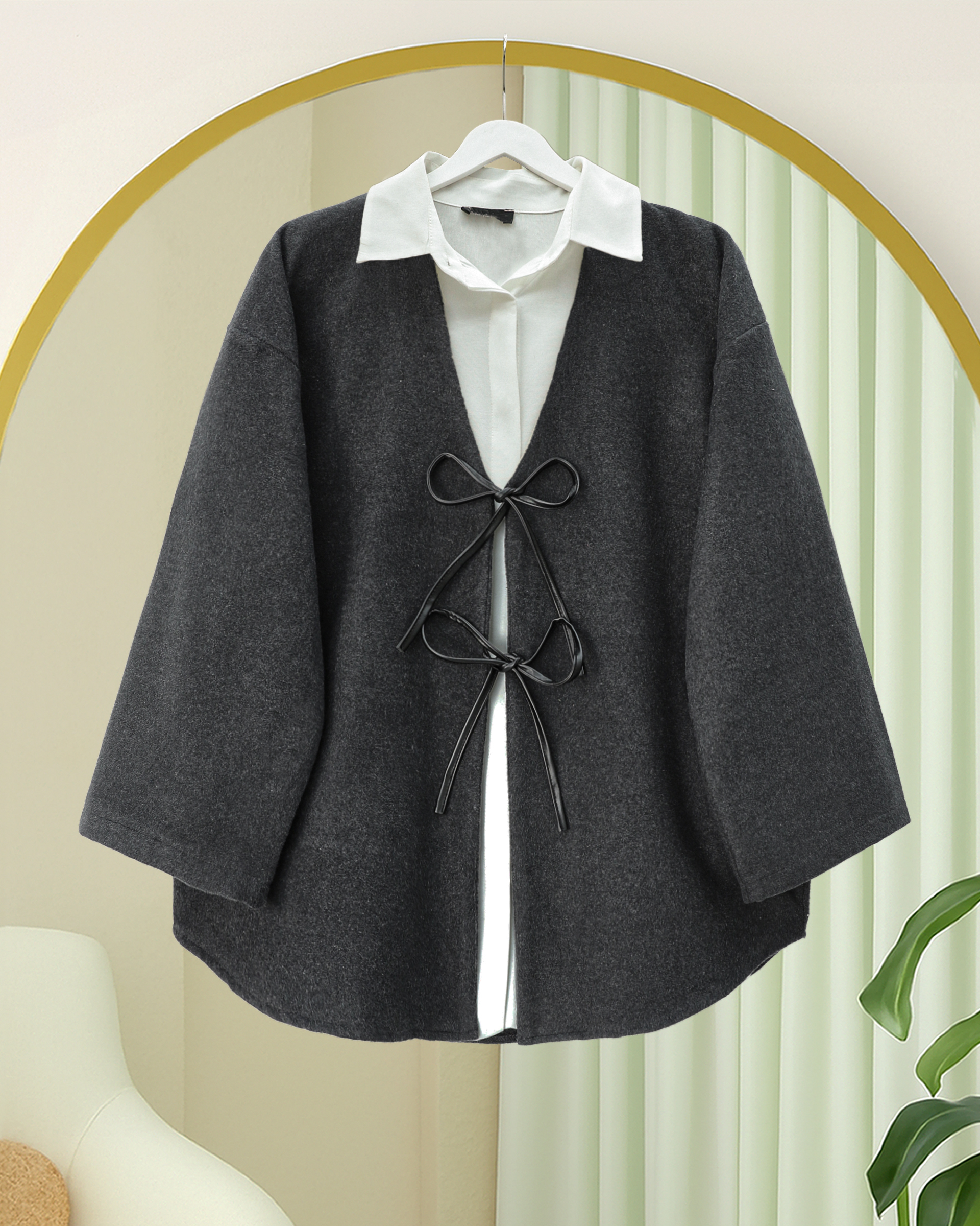 Önü Bağcıklı Oval Kesim Kaşe Kimono -Antrasit-Antrasit