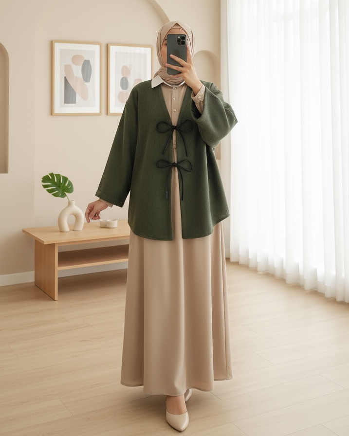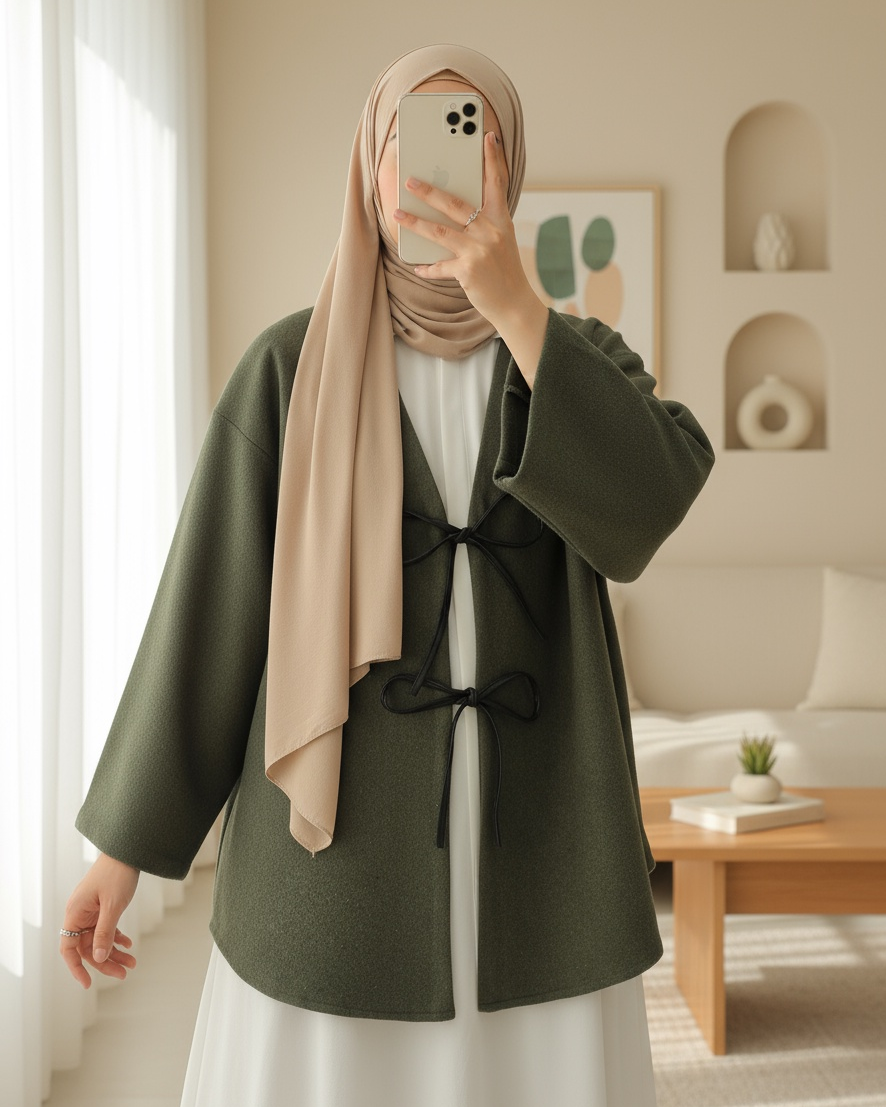 Önü Bağcıklı Oval Kesim Kaşe Kimono -Haki-Haki