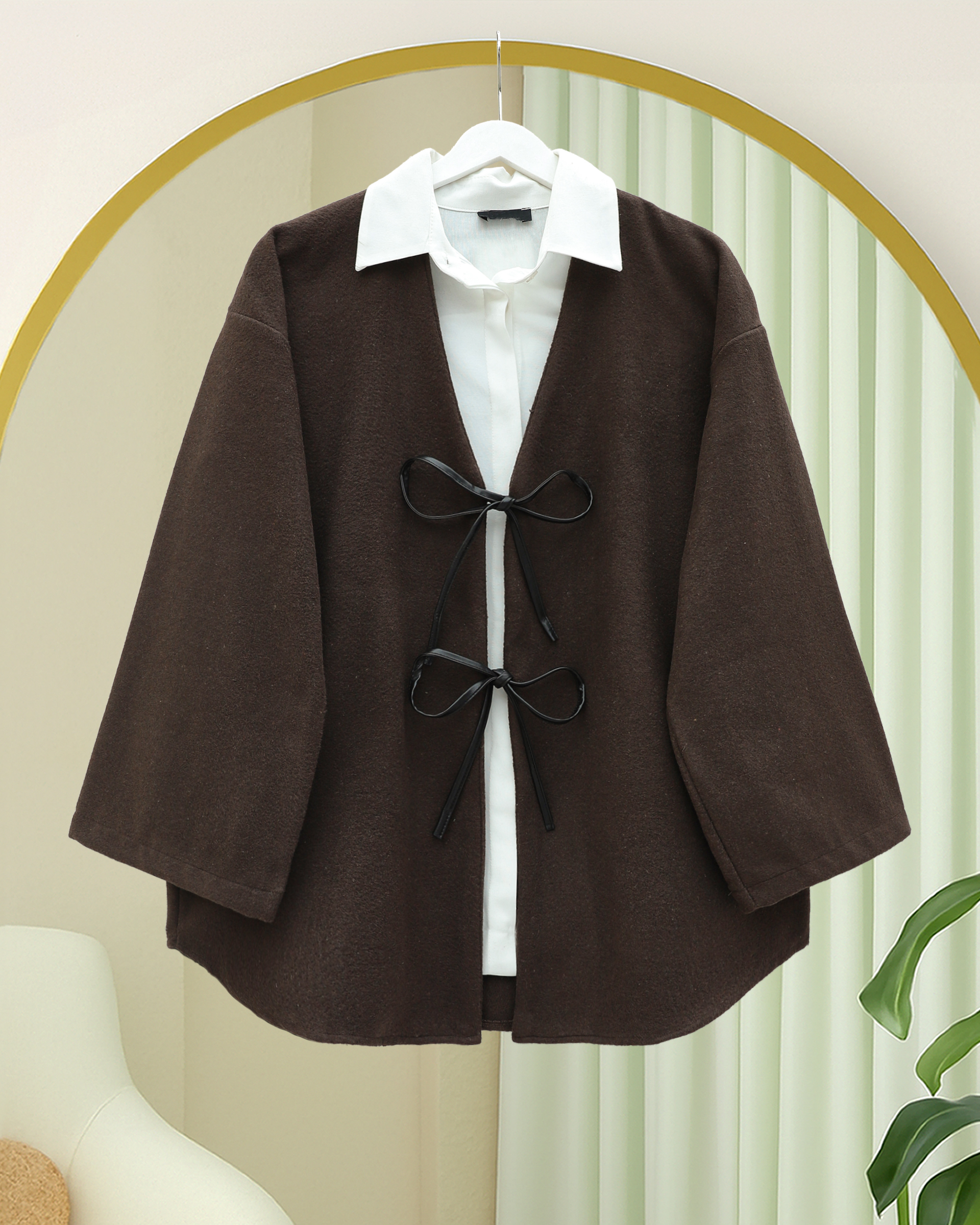 Önü Bağcıklı Oval Kesim Kaşe Kimono -Kahve-Kahve