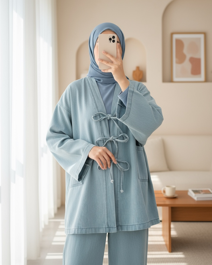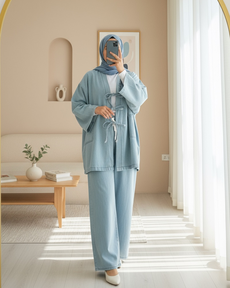 Önü Bağlamalı Cepli Pantolonlu Kot Kimono Takım -Açık Mavi-Açık Mavi