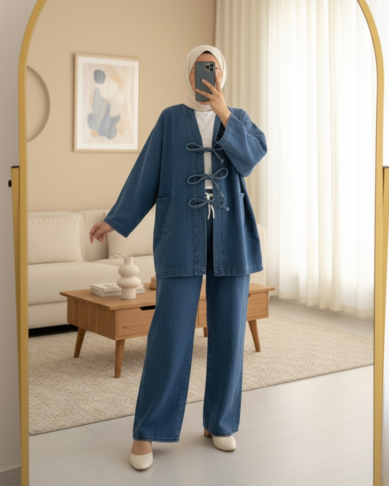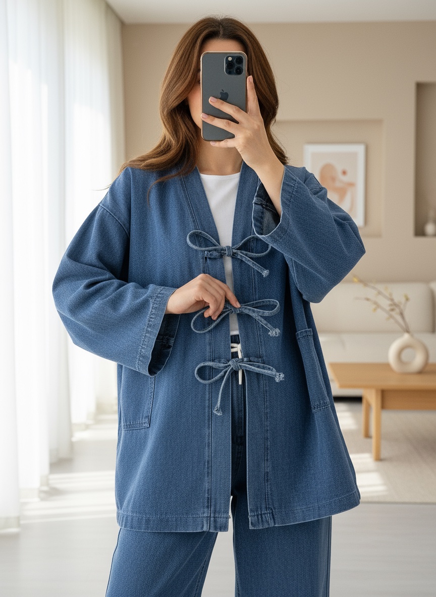 Önü Bağlamalı Cepli Pantolonlu Kot Kimono Takım -Koyu Mavi-Koyu Mavi