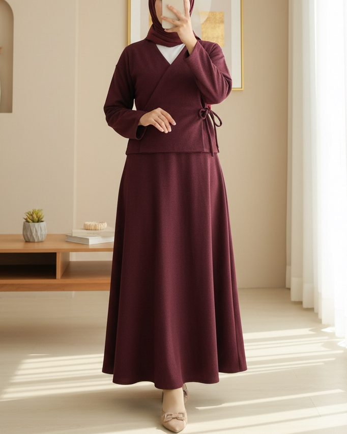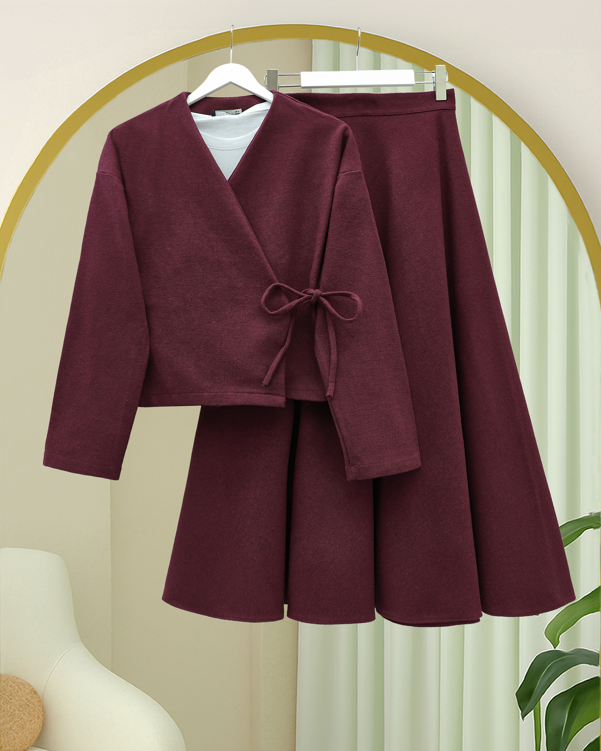 Önü Bağlamalı Etekli Kaşe Kimono Takım -Bordo-Bordo