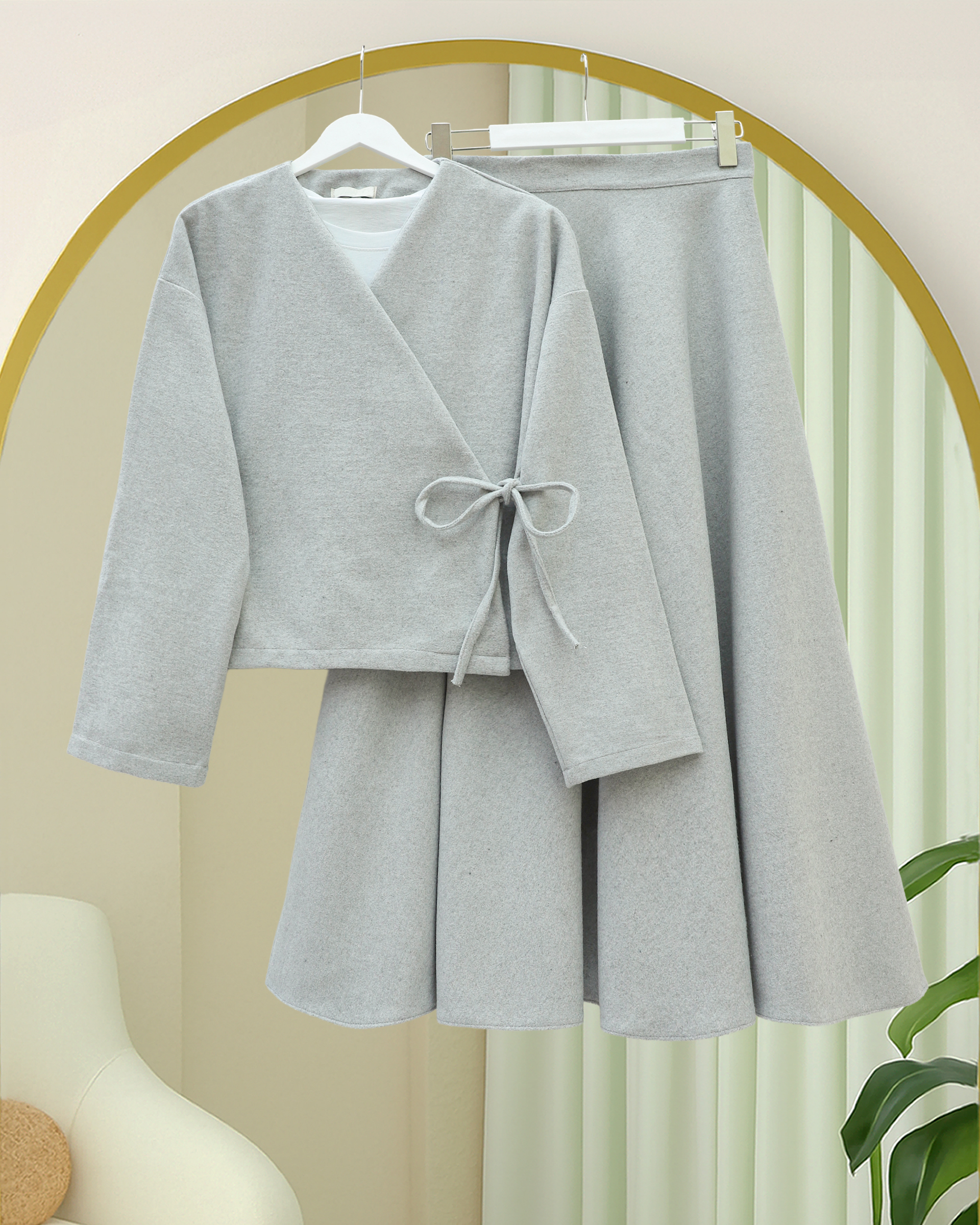 Önü Bağlamalı Etekli Kaşe Kimono Takım -Gri-Gri