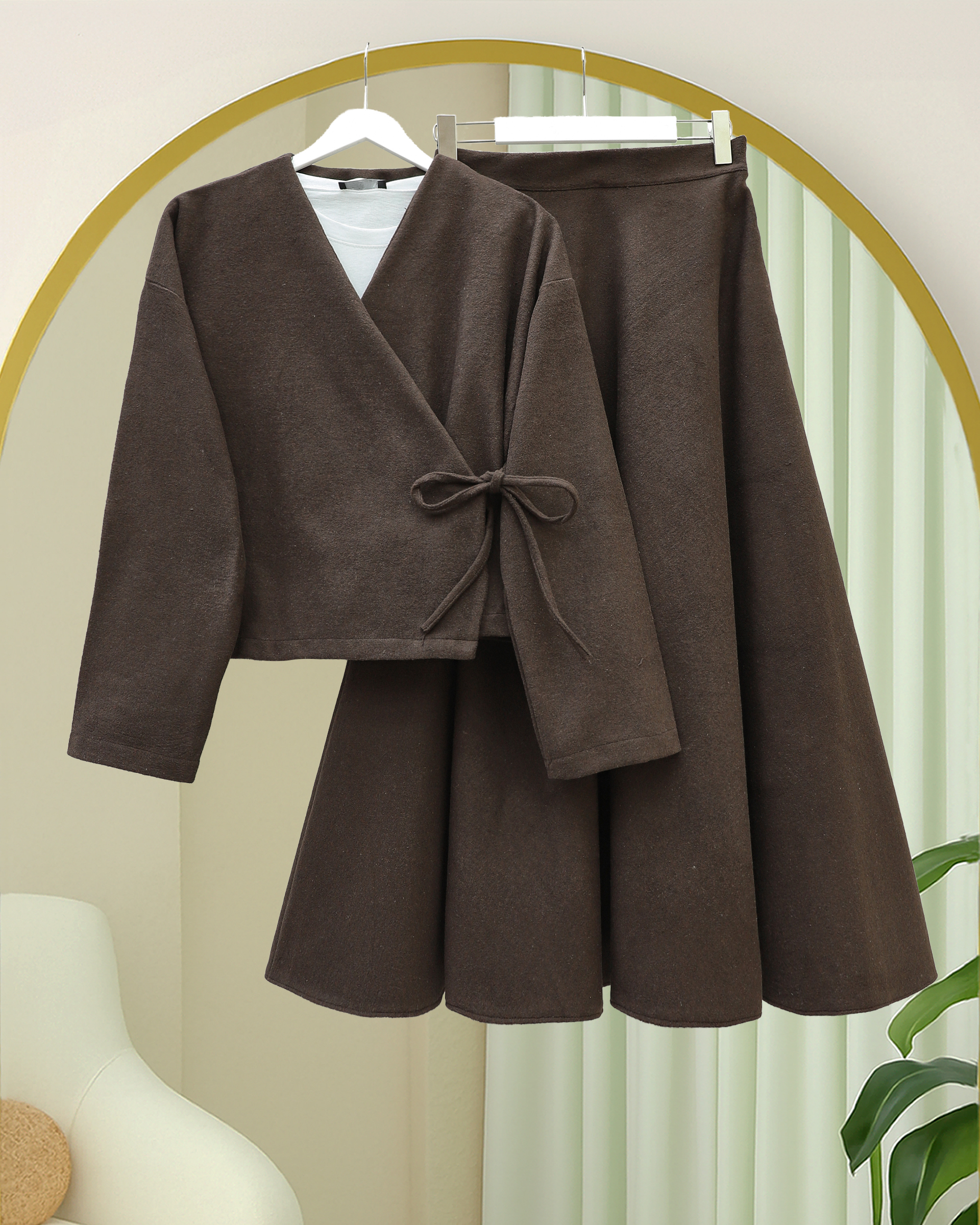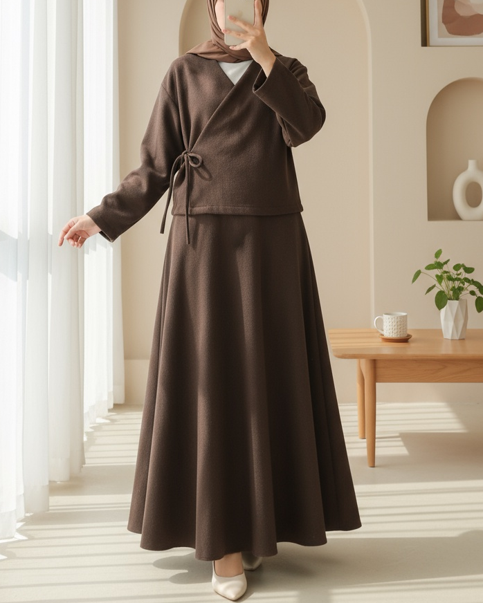 Önü Bağlamalı Etekli Kaşe Kimono Takım -Kahve-Kahve