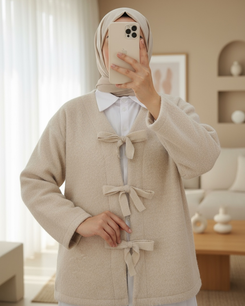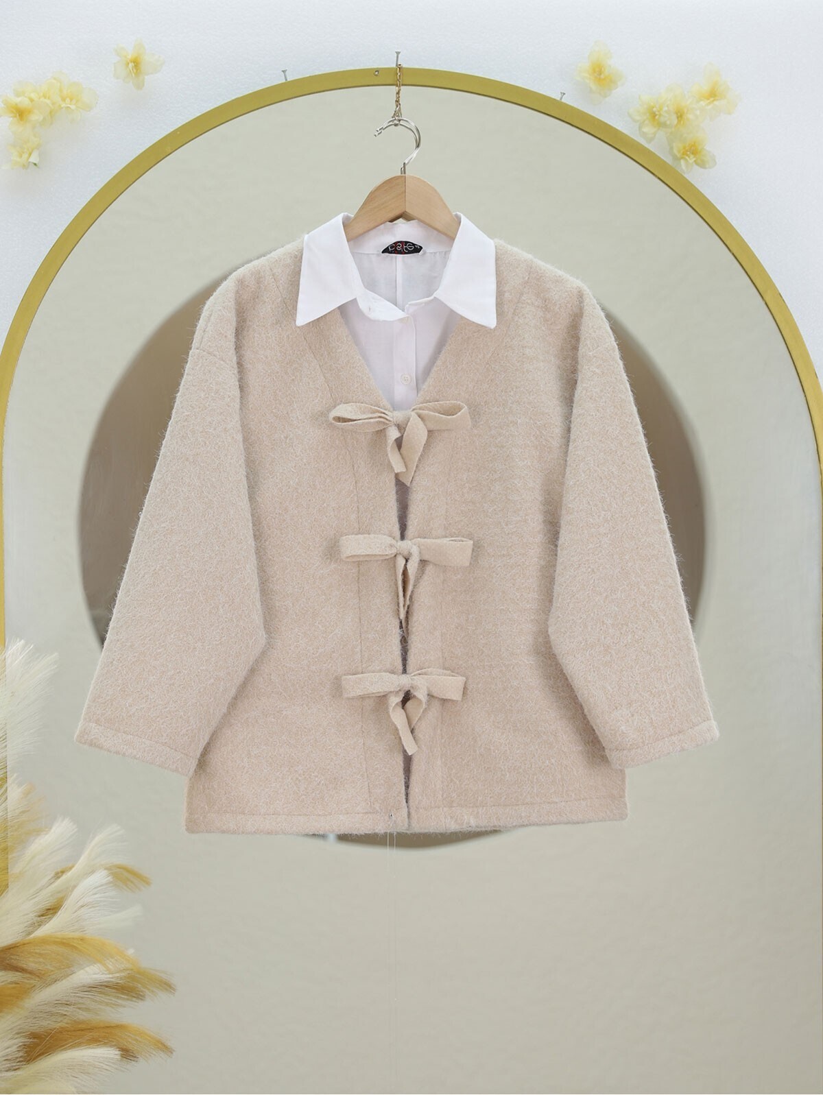 Önü Bağlamalı Kırçıllı Kaşe Ceket -Bej-Bej