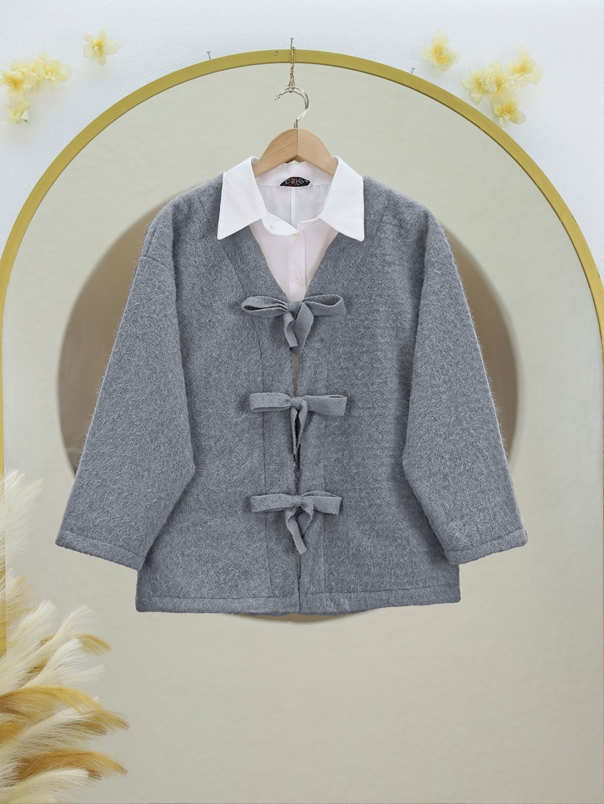Önü Bağlamalı Kırçıllı Kaşe Ceket -Gri-Gri
