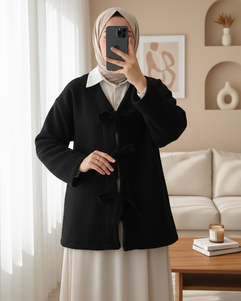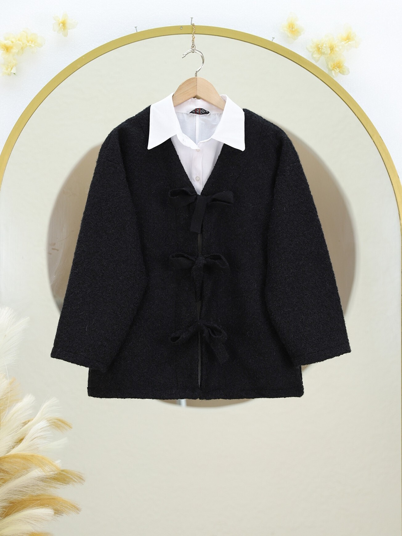 Önü Bağlamalı Kırçıllı Kaşe Ceket -Siyah-Siyah