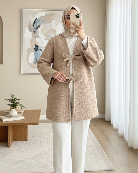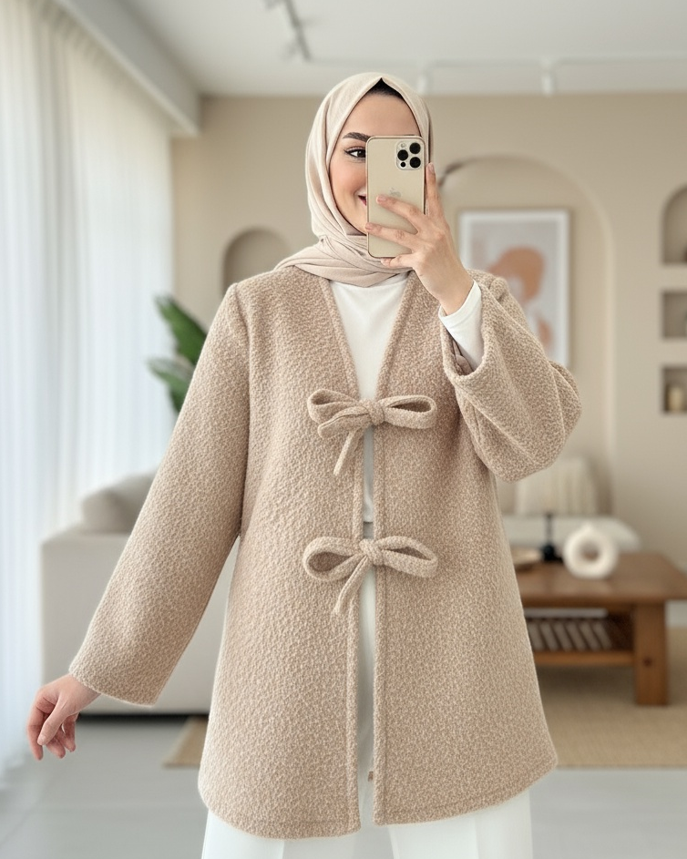 Önü Bağlamalı Sakallı Kimono -Bej-Bej