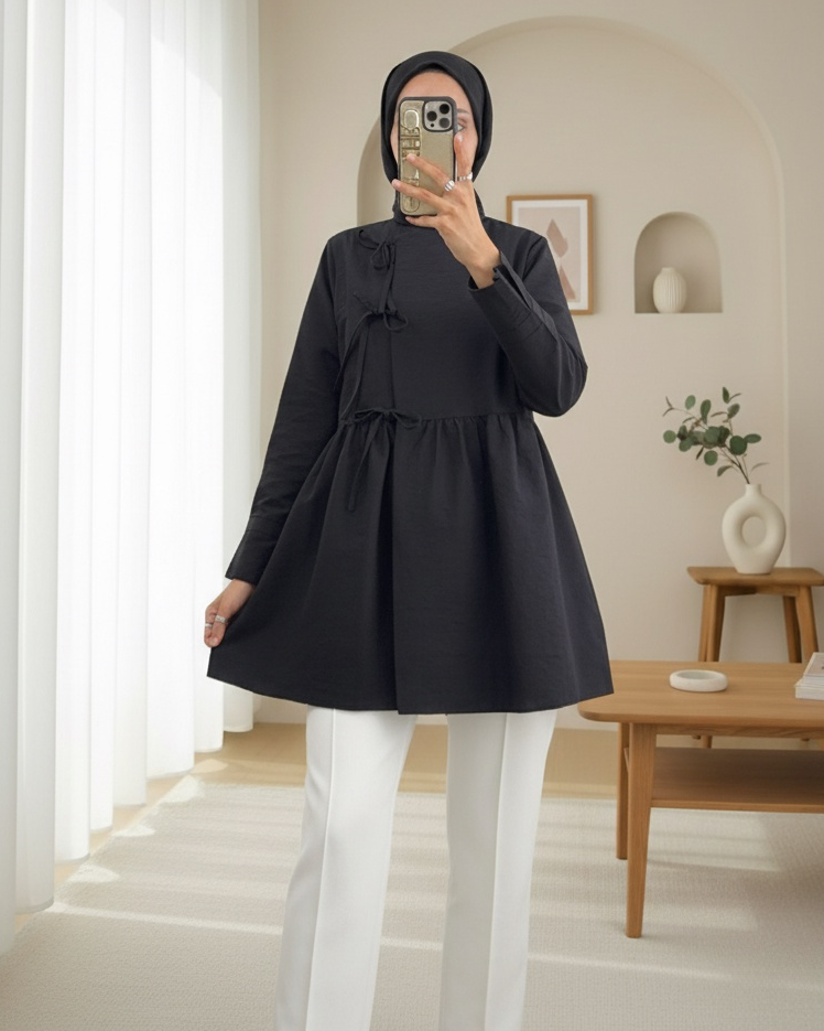 Önü Çapraz Bağlamalı Parçalı Kimono -Siyah-siyah
