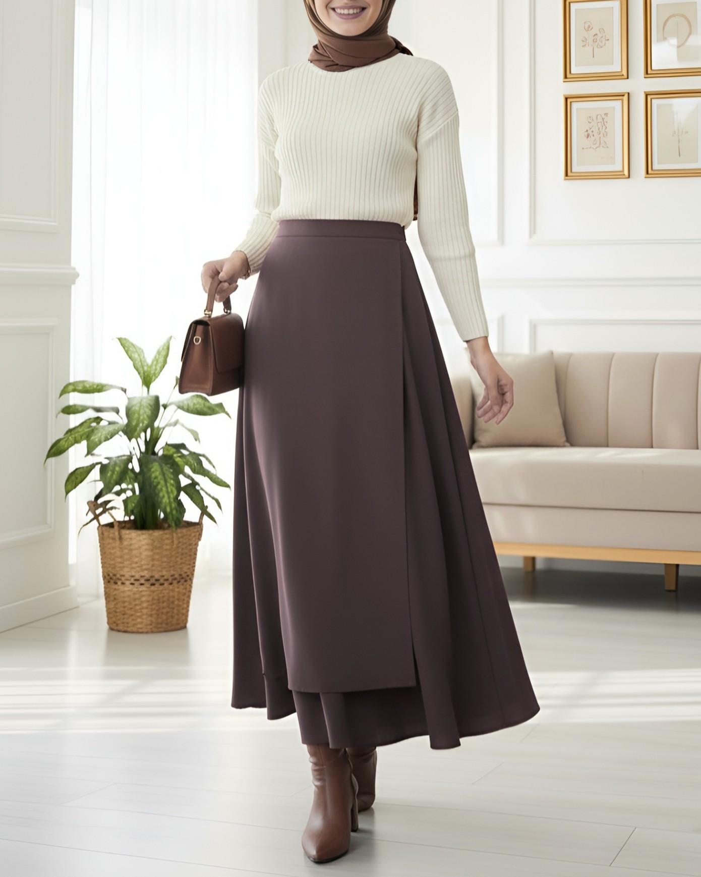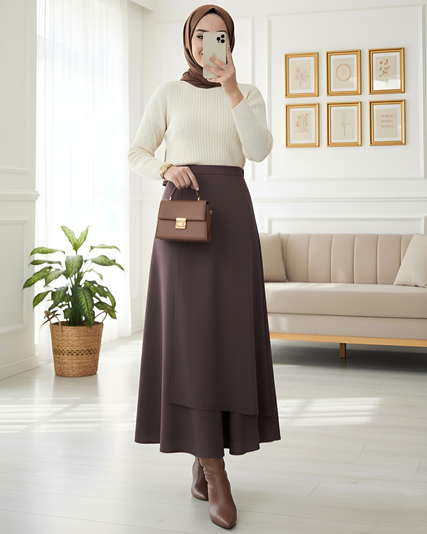 Önü Çapraz Çift Katlı Scuba Etek -K. Kahve-K. Kahve