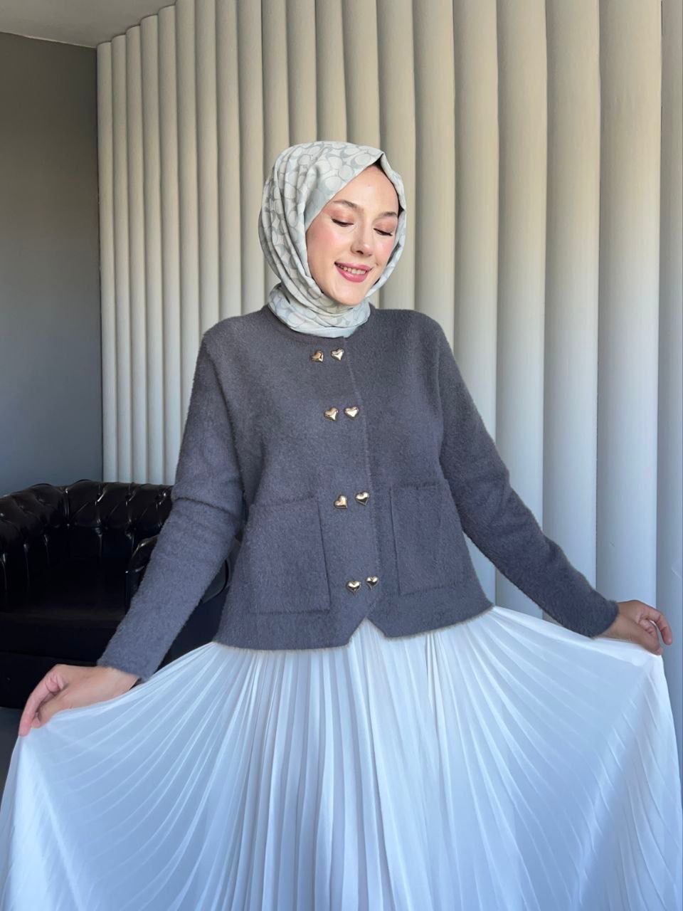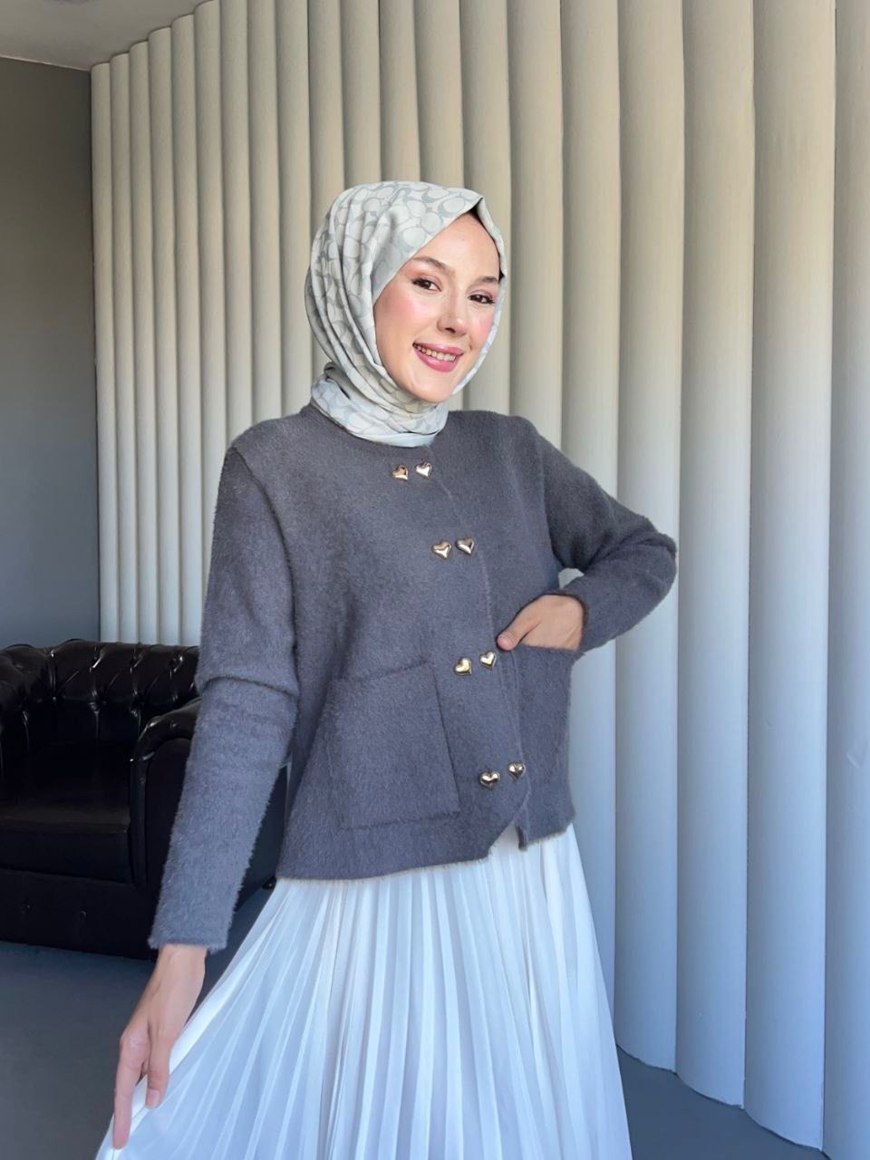 Önü Cepli Kalp Düğmeli Sakallı Hırka -Füme-Füme