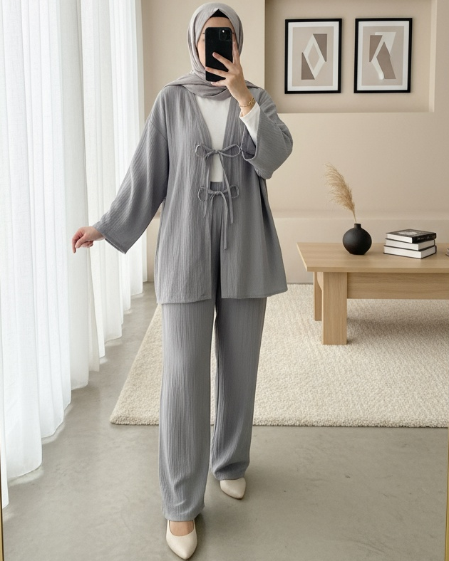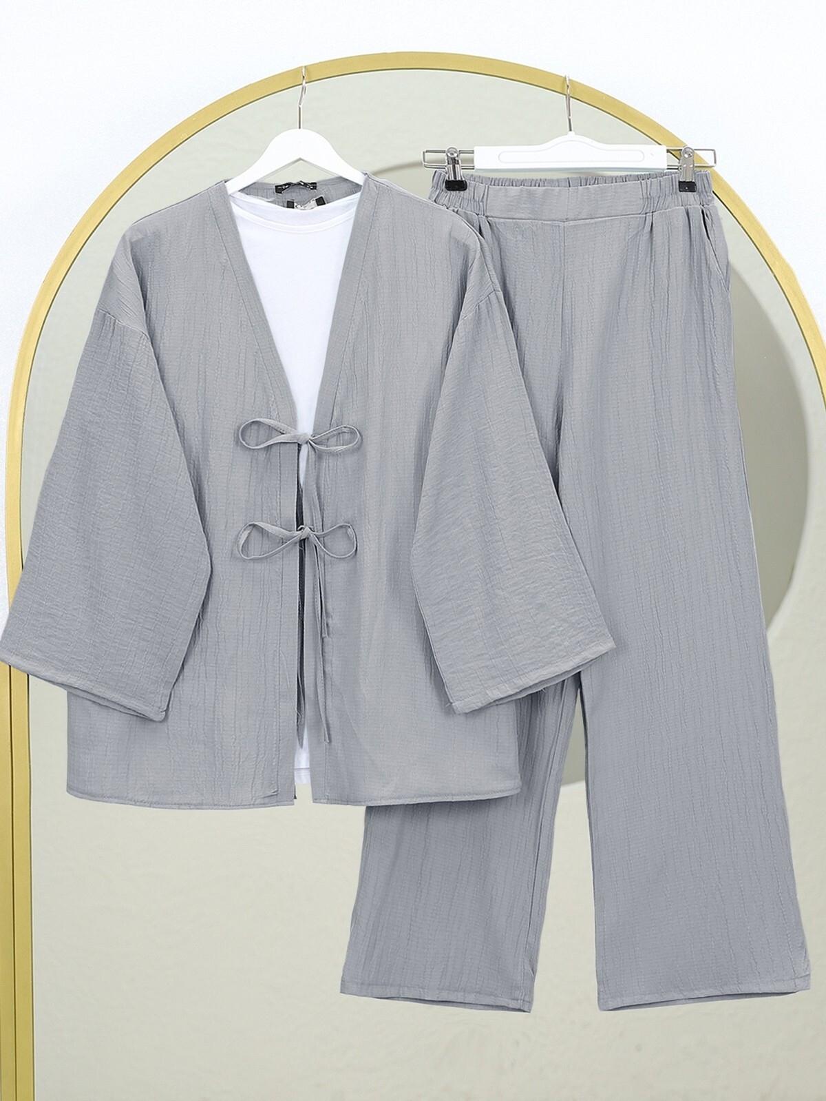 Önü Çift Bağcıklı Pantolonlu Krınkıl Takım -Gri-Gri