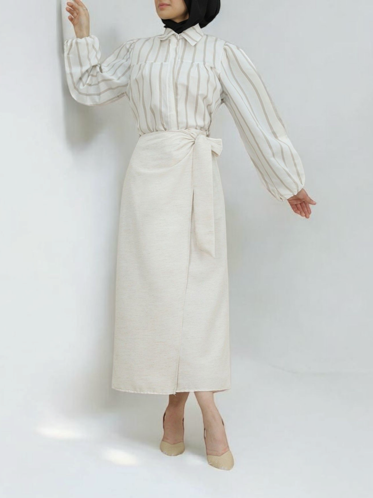 Önü Çift Kat Yandan Bağlamalı Keten Etek -Taş-Taş