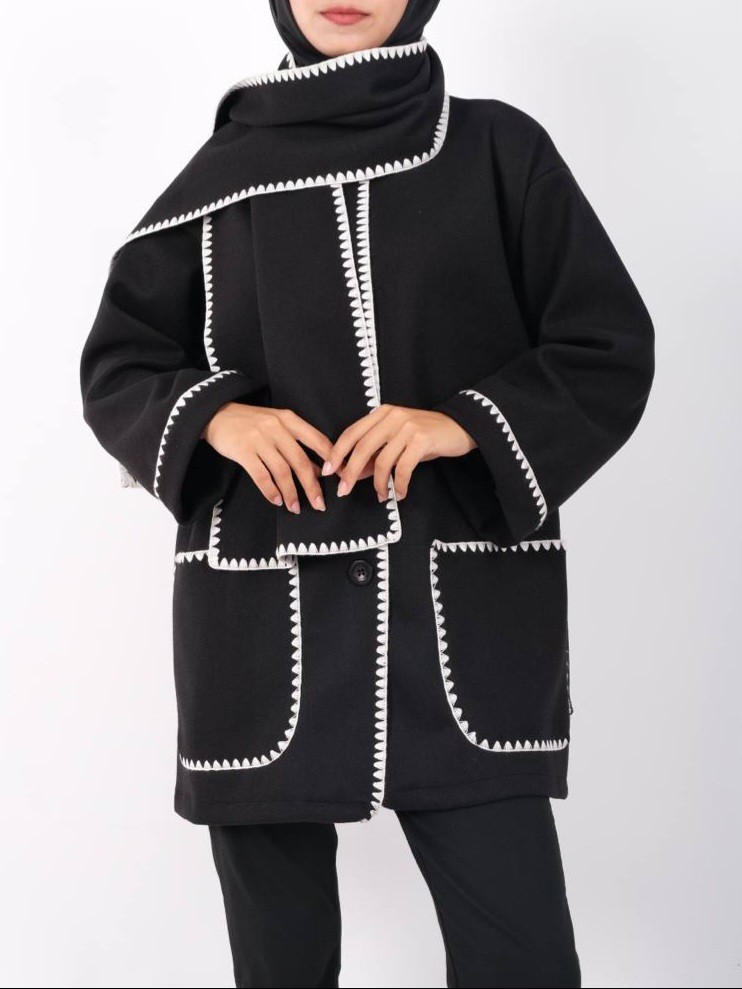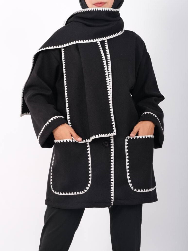Önü Düğmeli Atkılı Cepli Ceket -Siyah-siyah