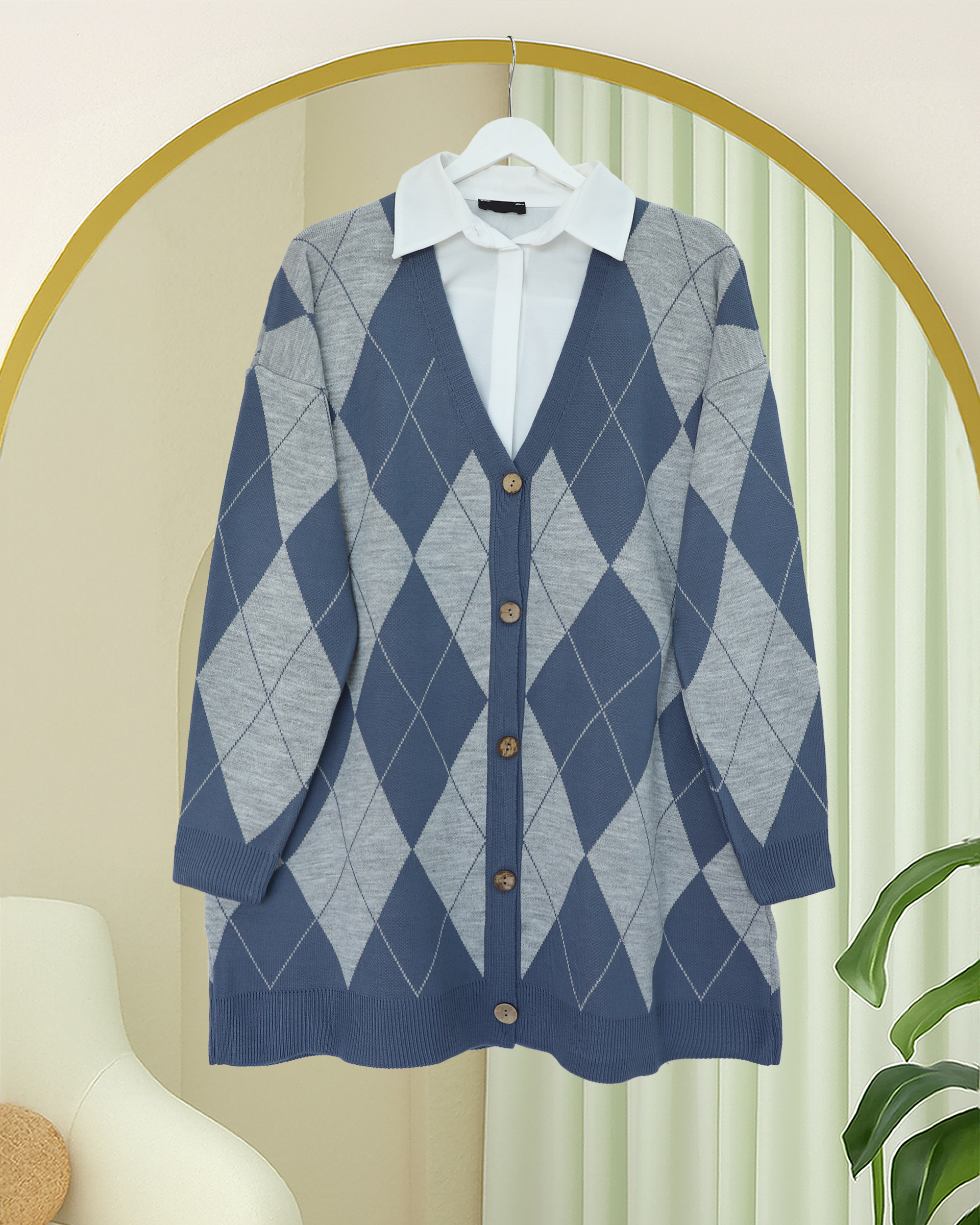 Önü Düğmeli Baklava Desen Salaş Triko Hırka -İndigo-İndigo
