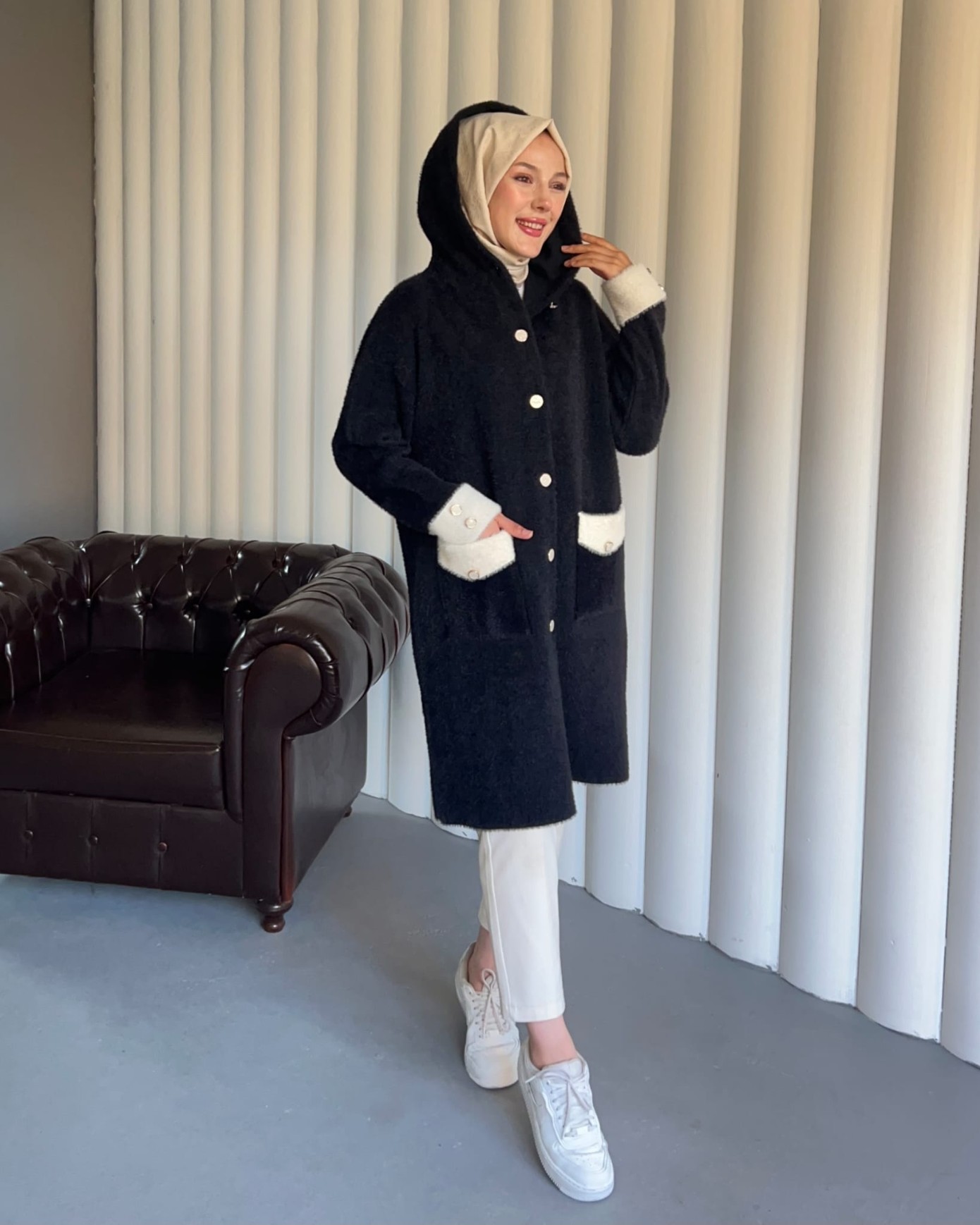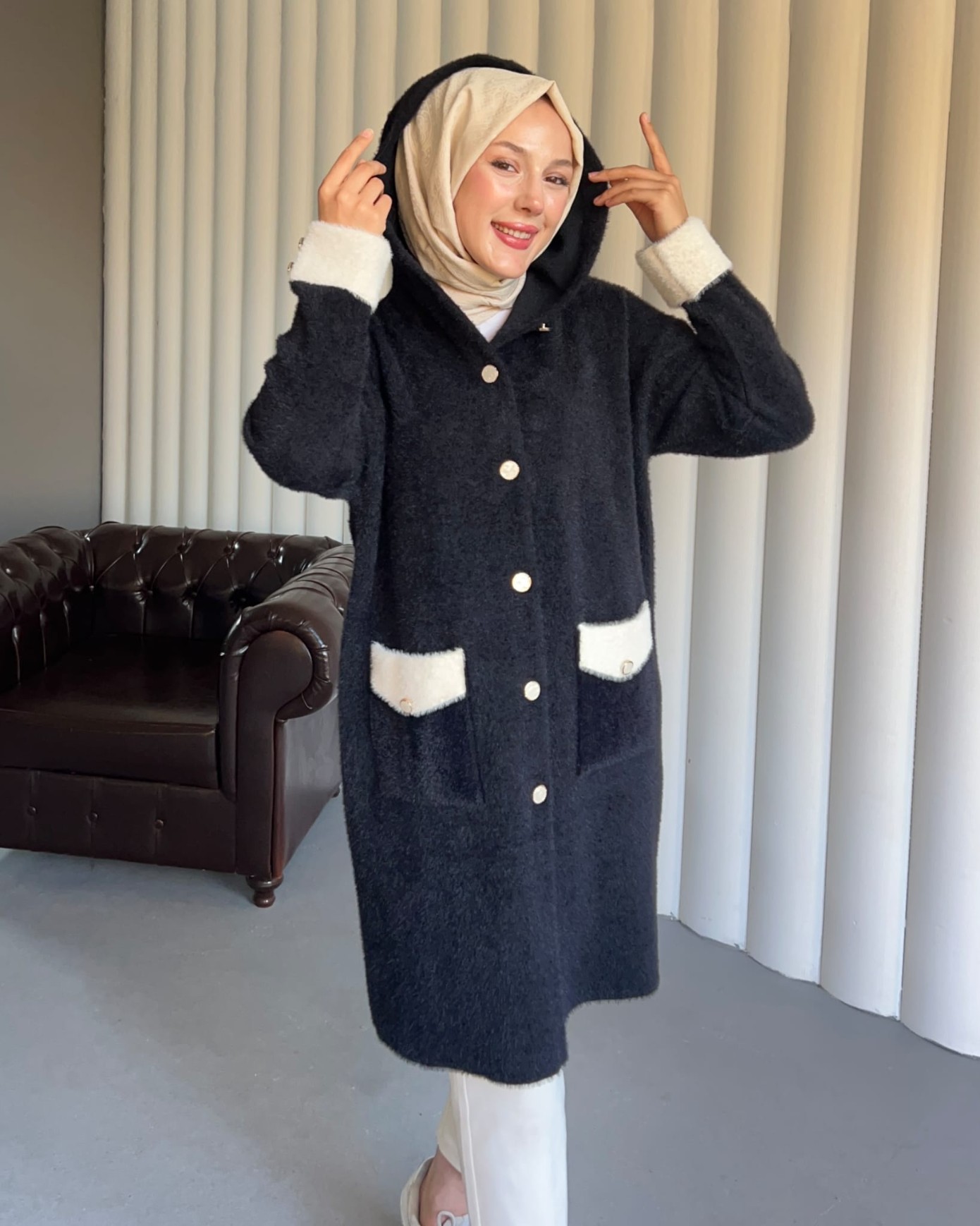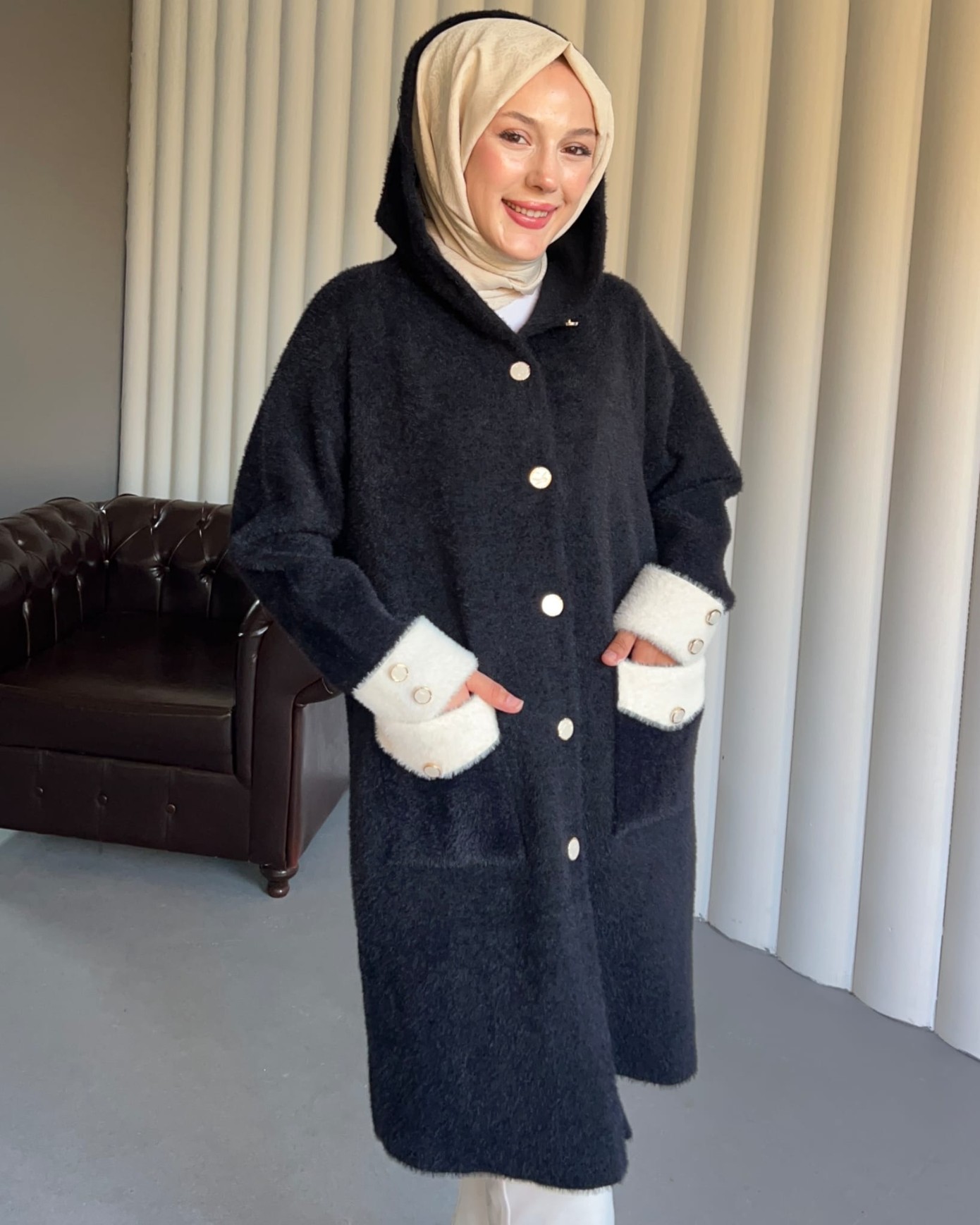 Önü Düğmeli Cepli Kapşonlu Sakallı Kap -Siyah-siyah