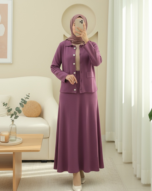Önü Düğmeli Etekli Yakalı Triko Takım -Mürdüm-Mürdüm