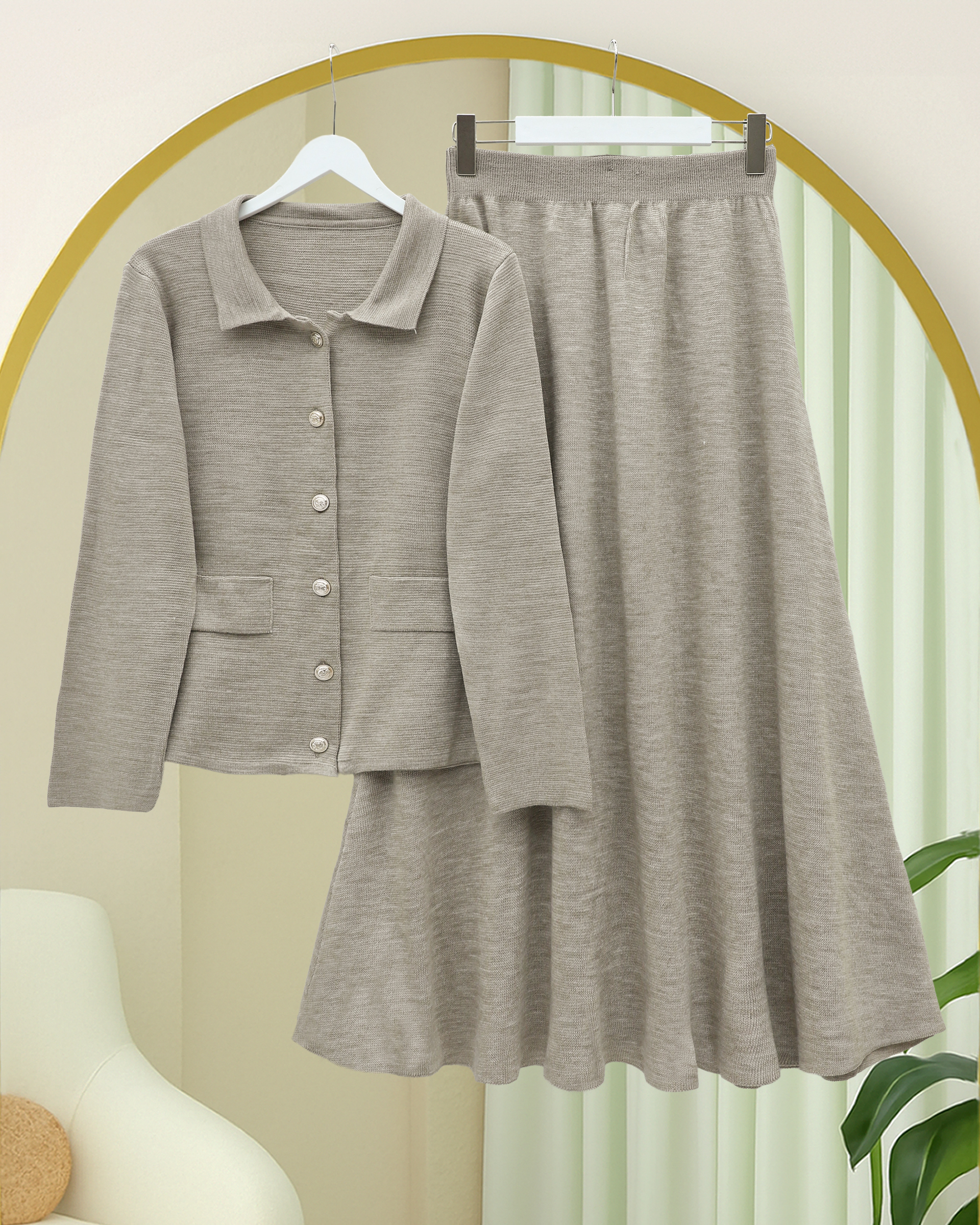 Önü Düğmeli Etekli Yakalı Triko Takım -Toprak-Toprak