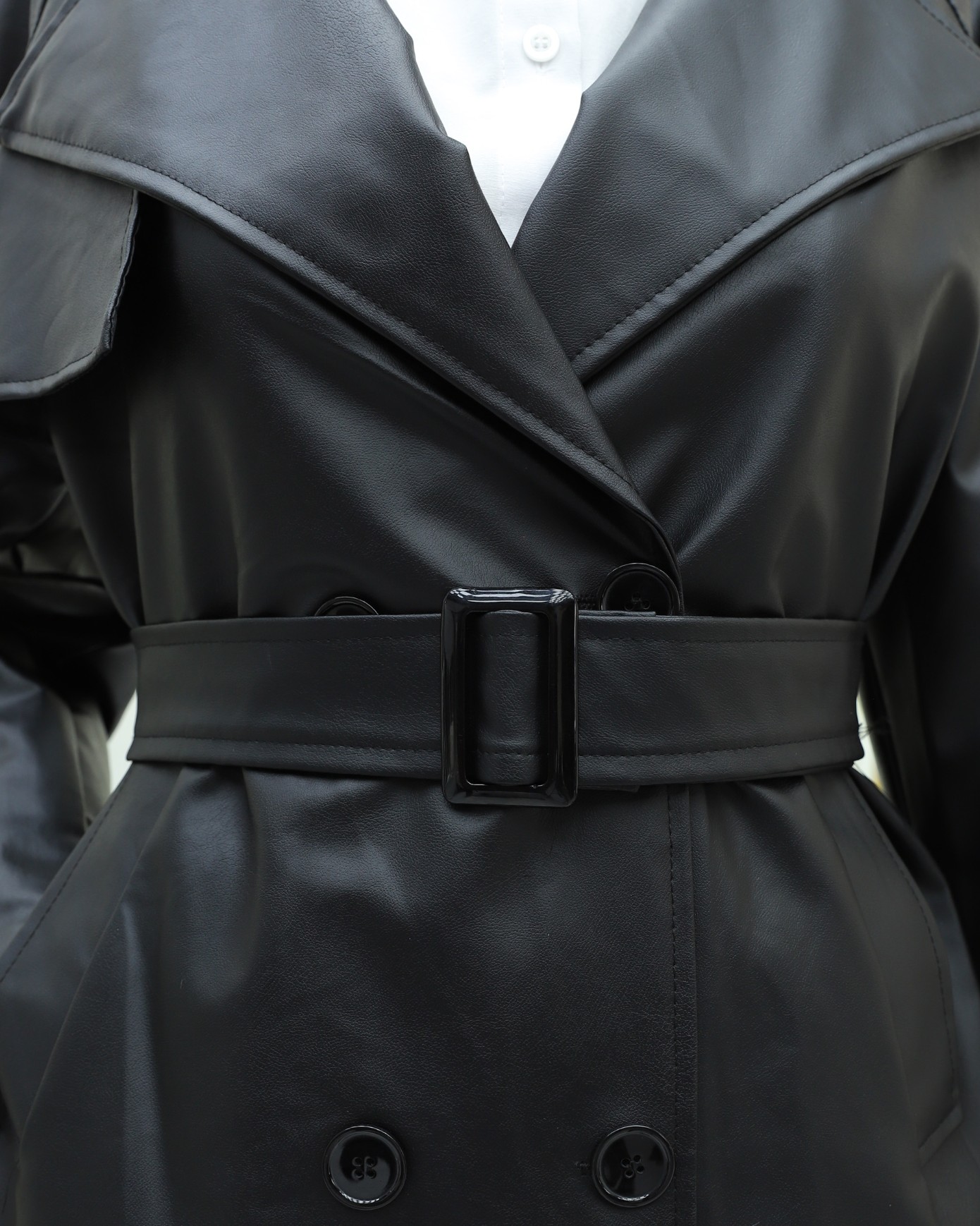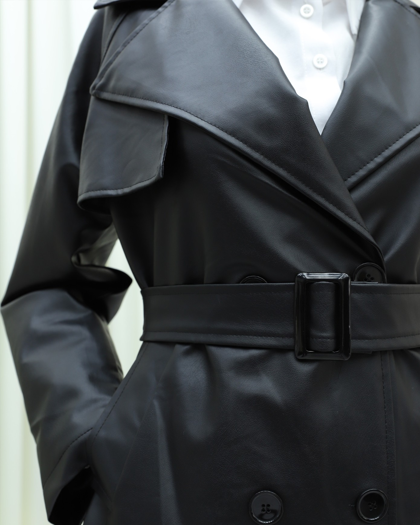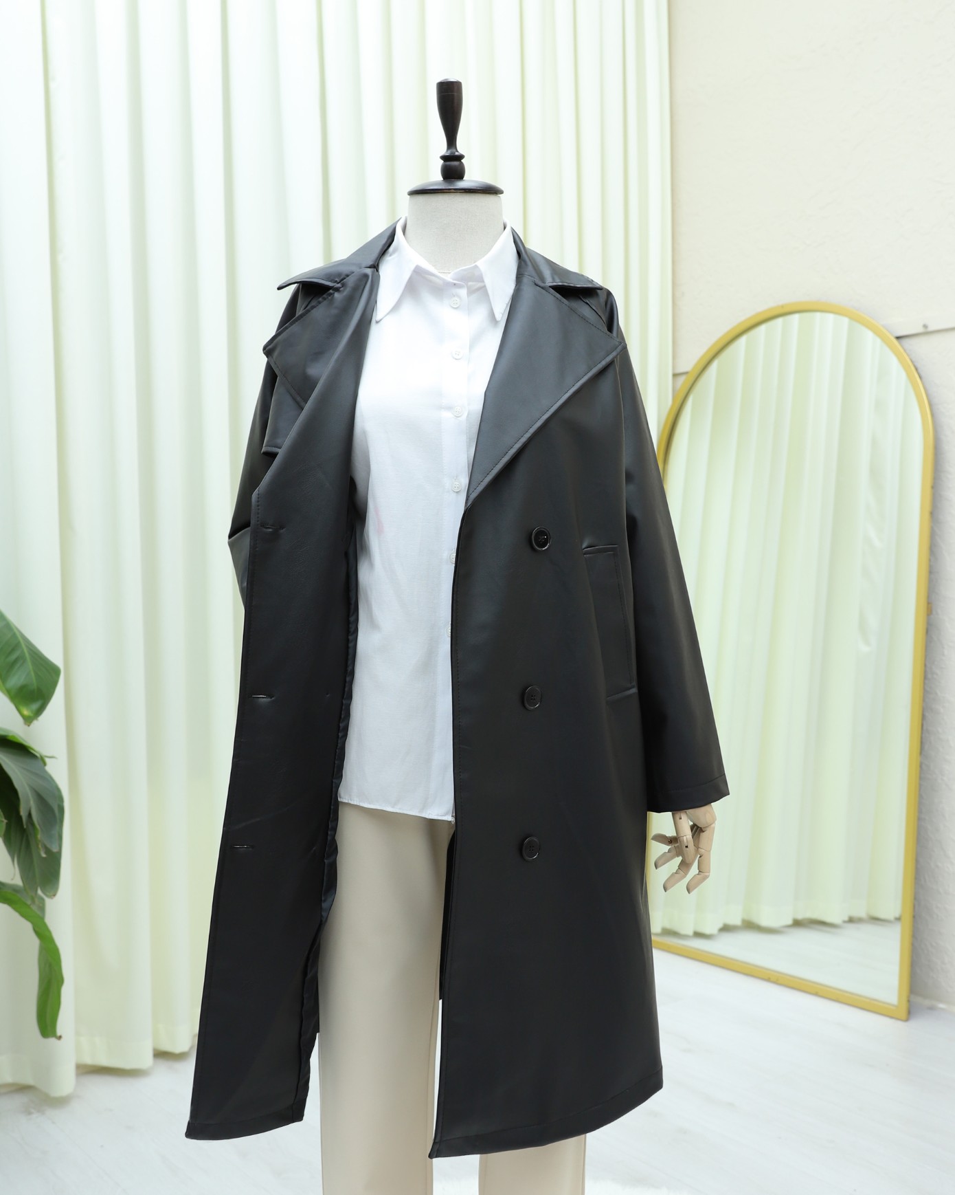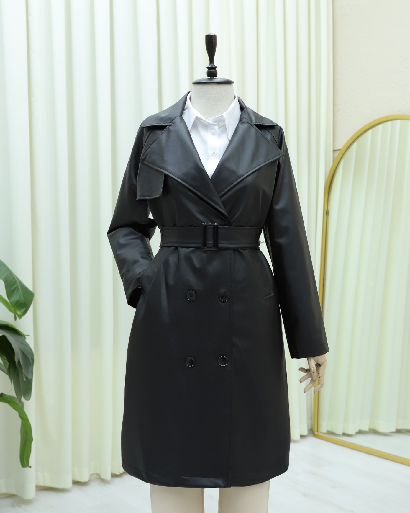Önü Düğmeli Kemerli Astarlı Deri Pardesü -Siyah-siyah
