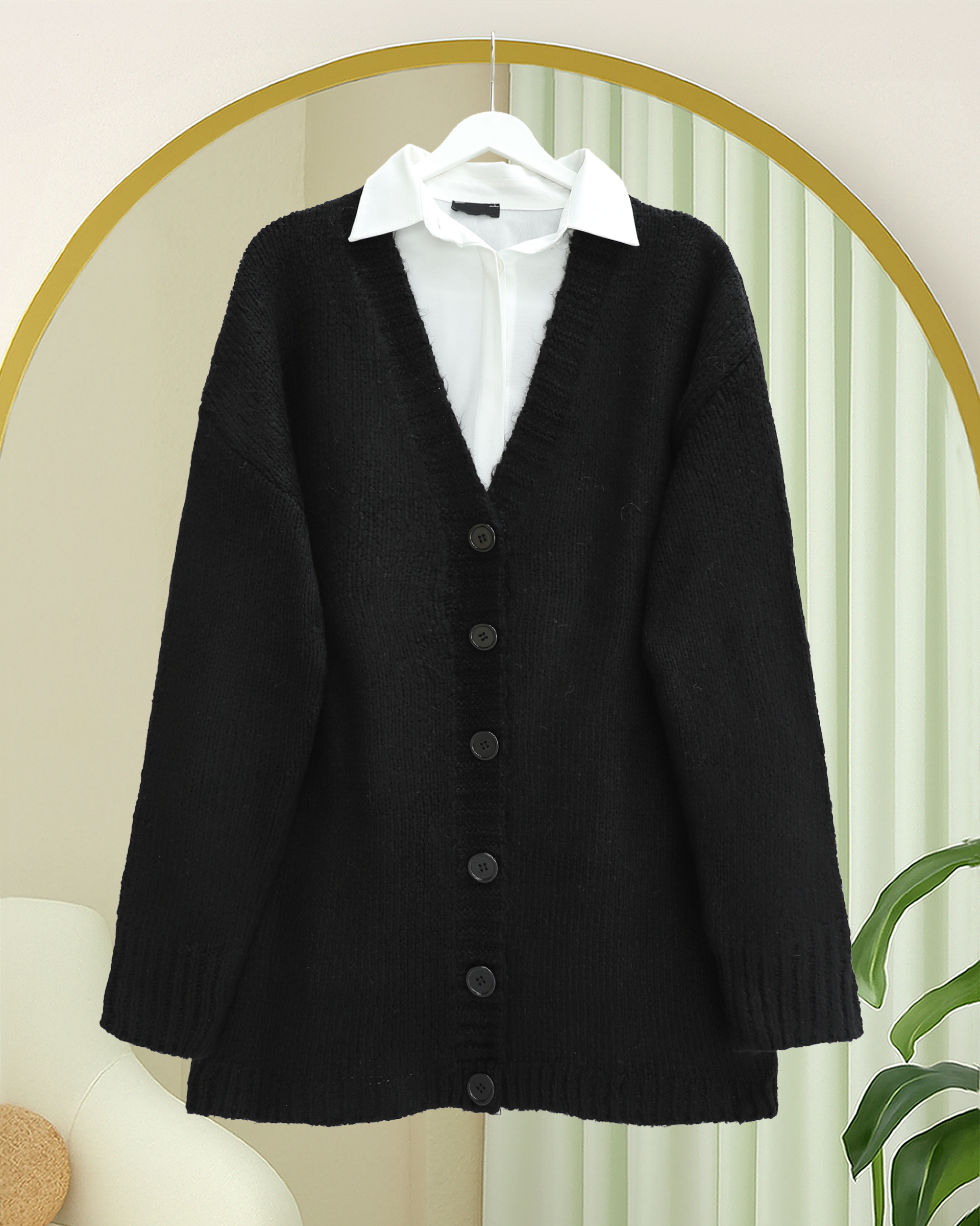 Önü Düğmeli Örme Triko Hırka -Siyah-siyah