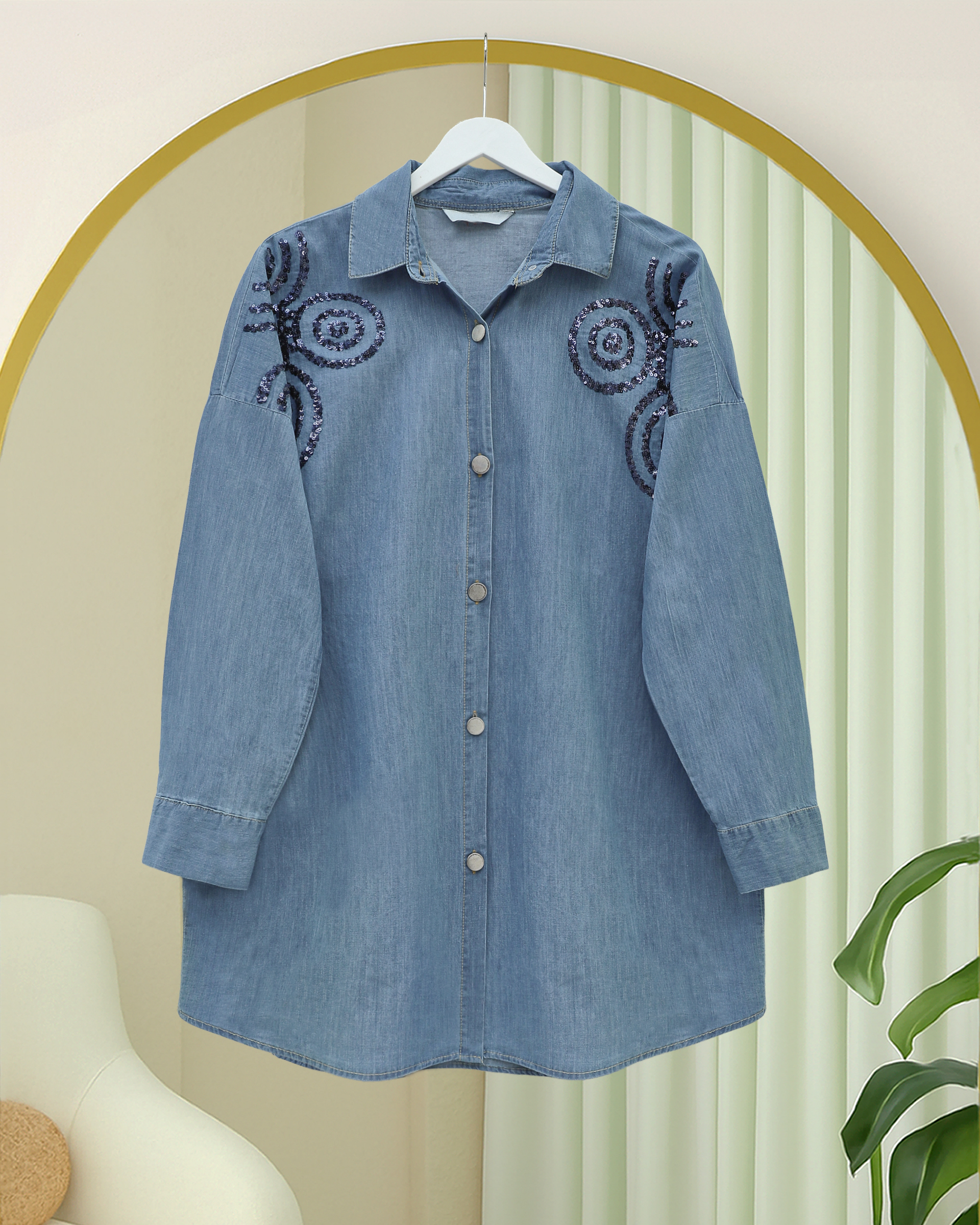 Önü Düğmeli Pul Payet Detaylı Kot Gömlek -Açık Mavi-Açık Mavi