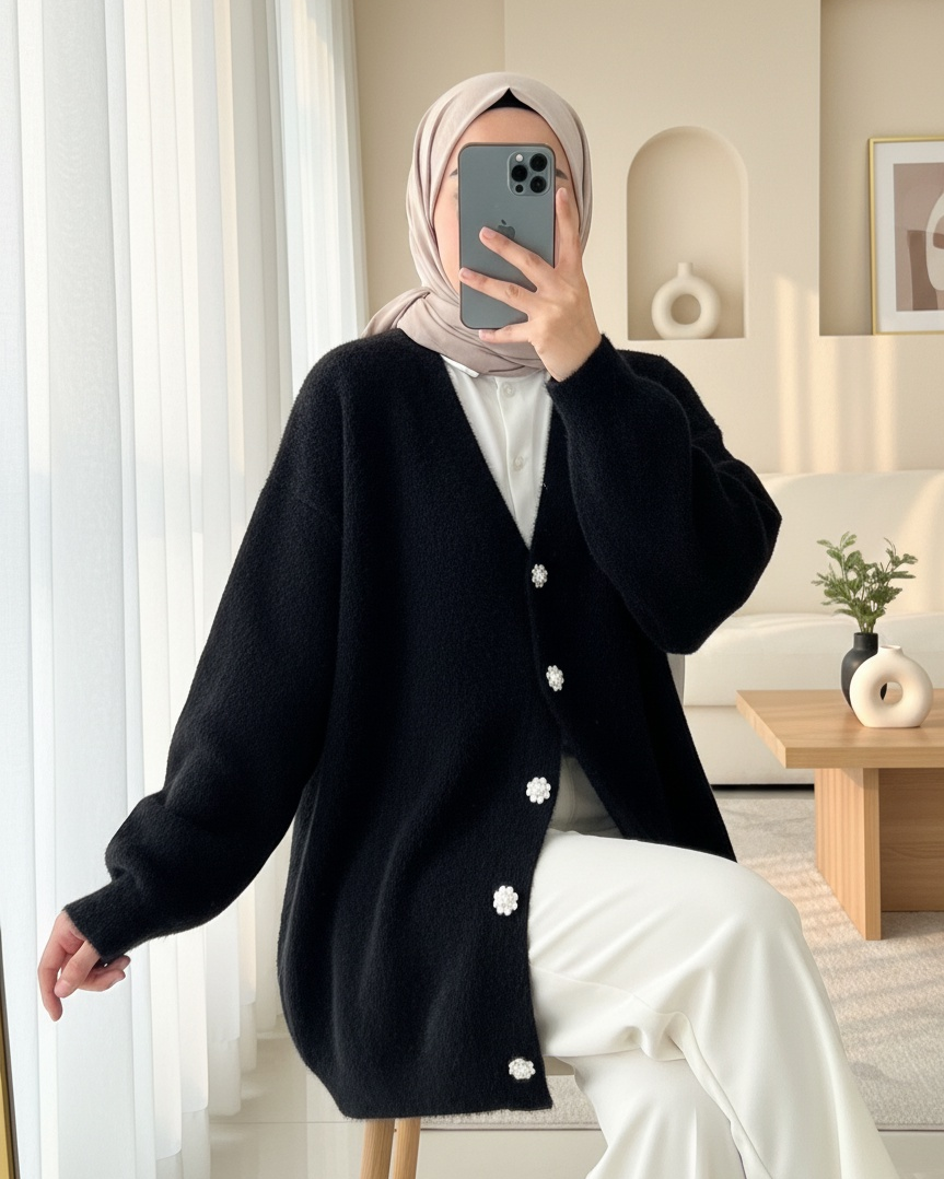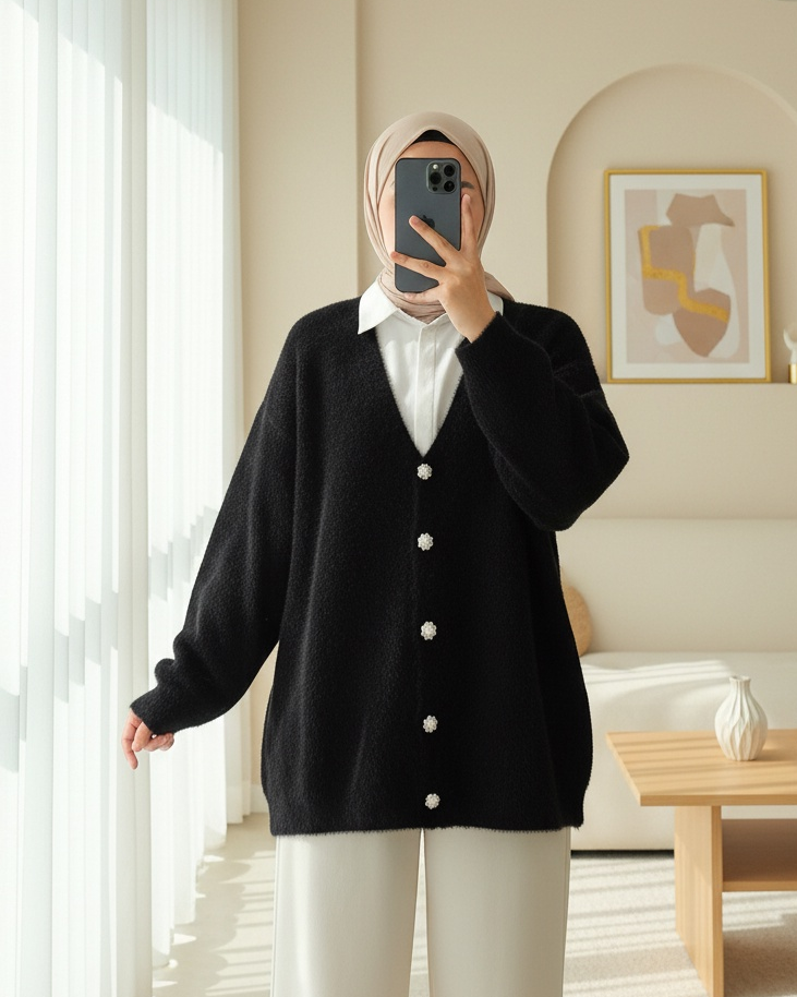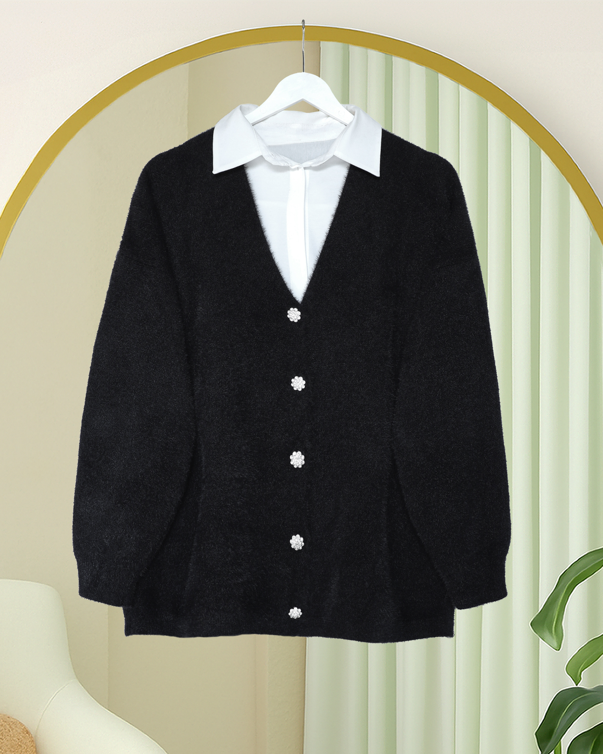 Önü Düğmeli Sakallı Salaş Triko Hırka -Siyah-siyah