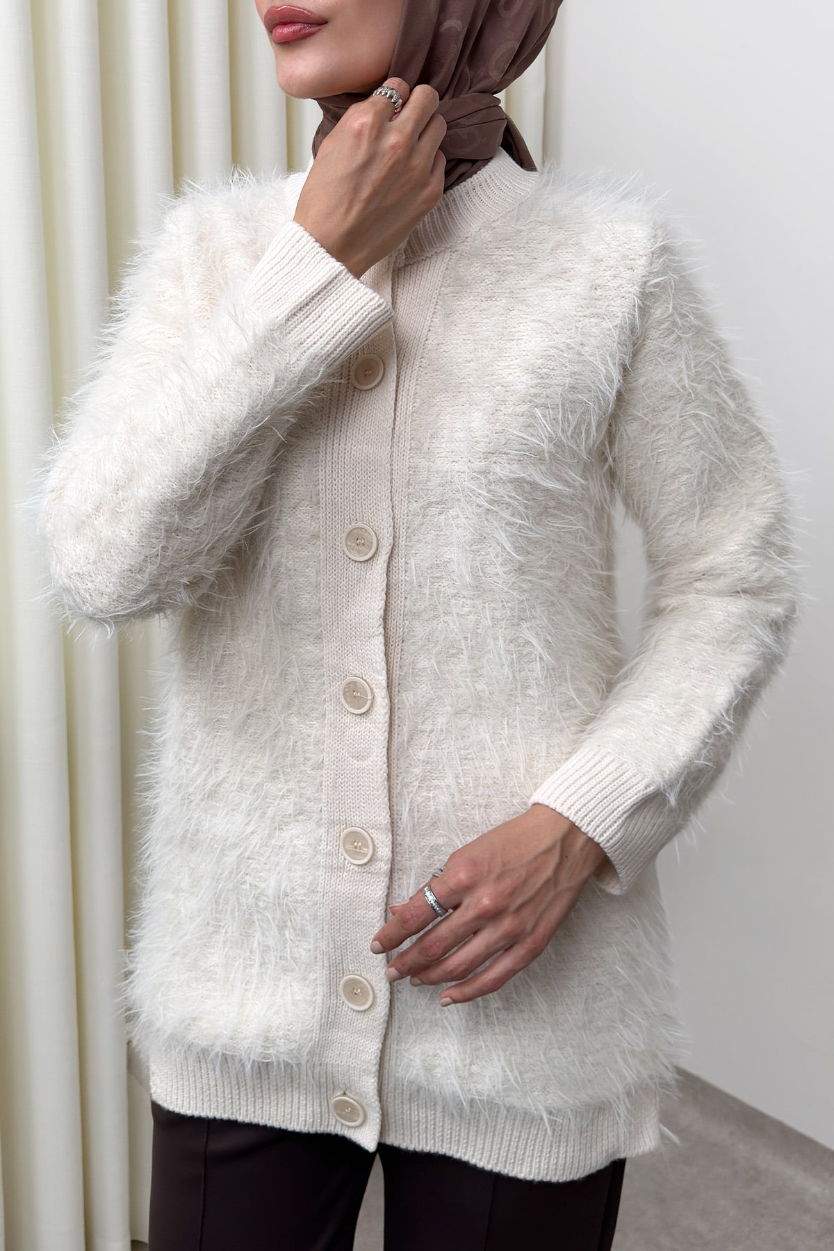 Önü Düğmeli Triko Hırka Ekru-Ekru