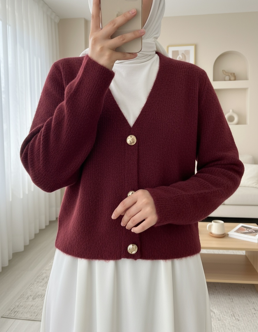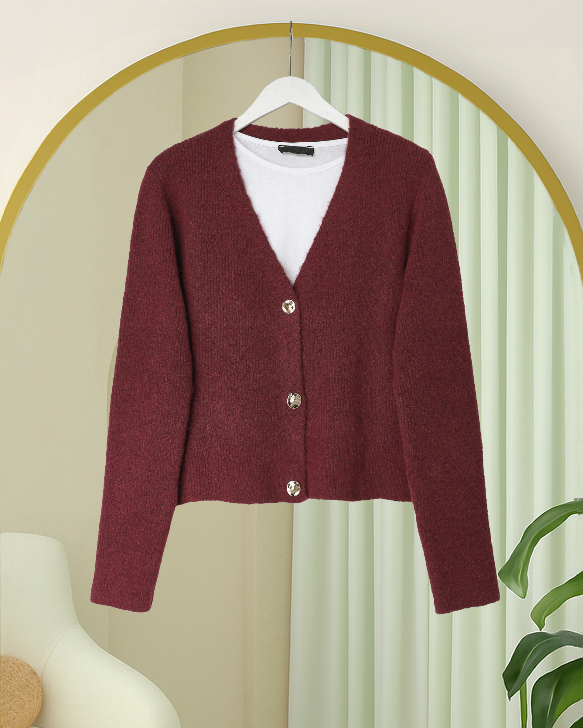 Önü Düğmeli Yumoş Triko Hırka -Bordo-Bordo