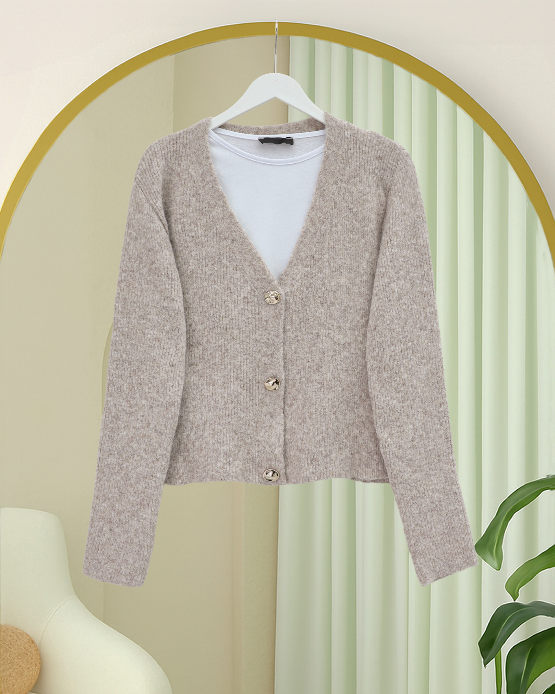 Önü Düğmeli Yumoş Triko Hırka -Taş-Taş