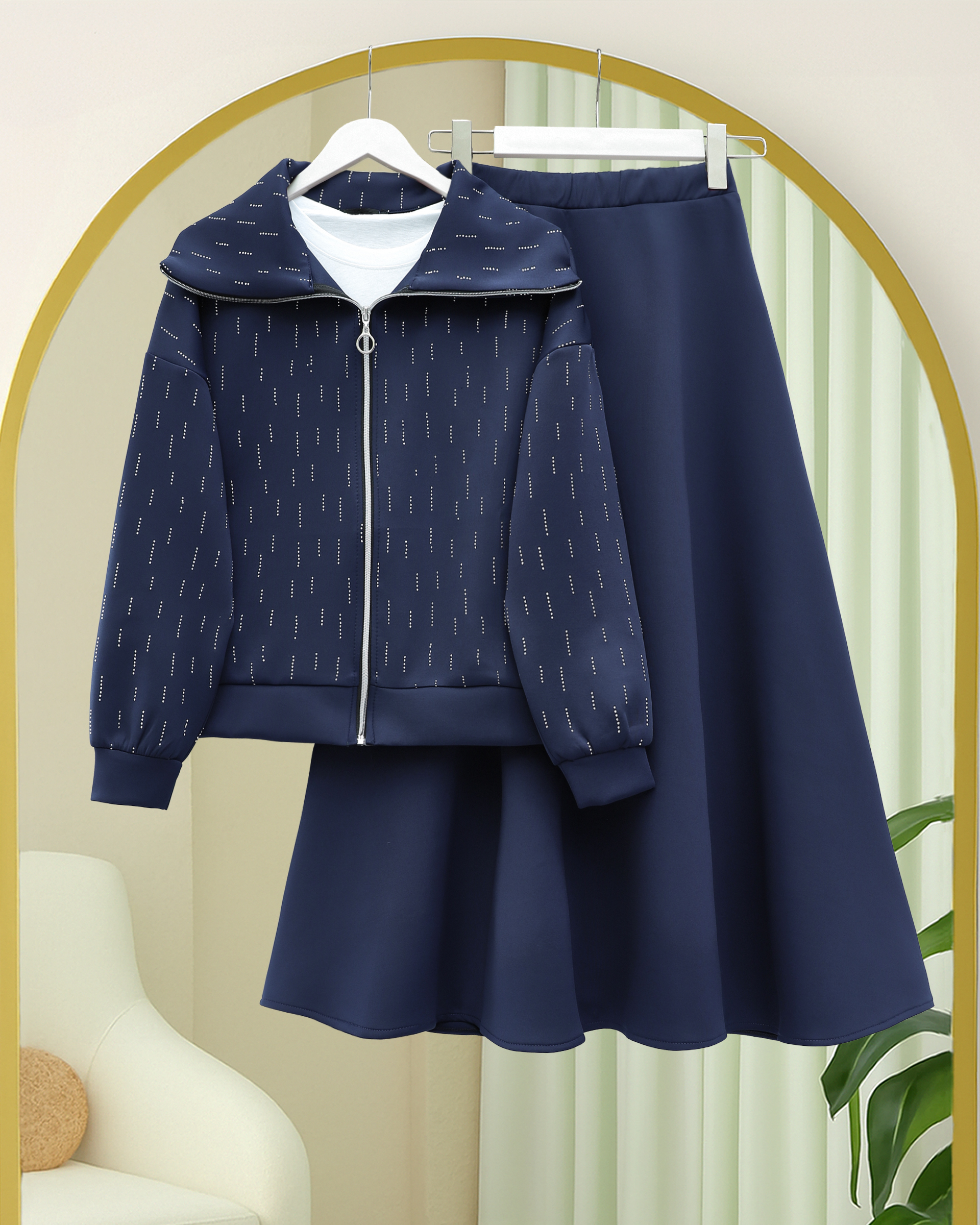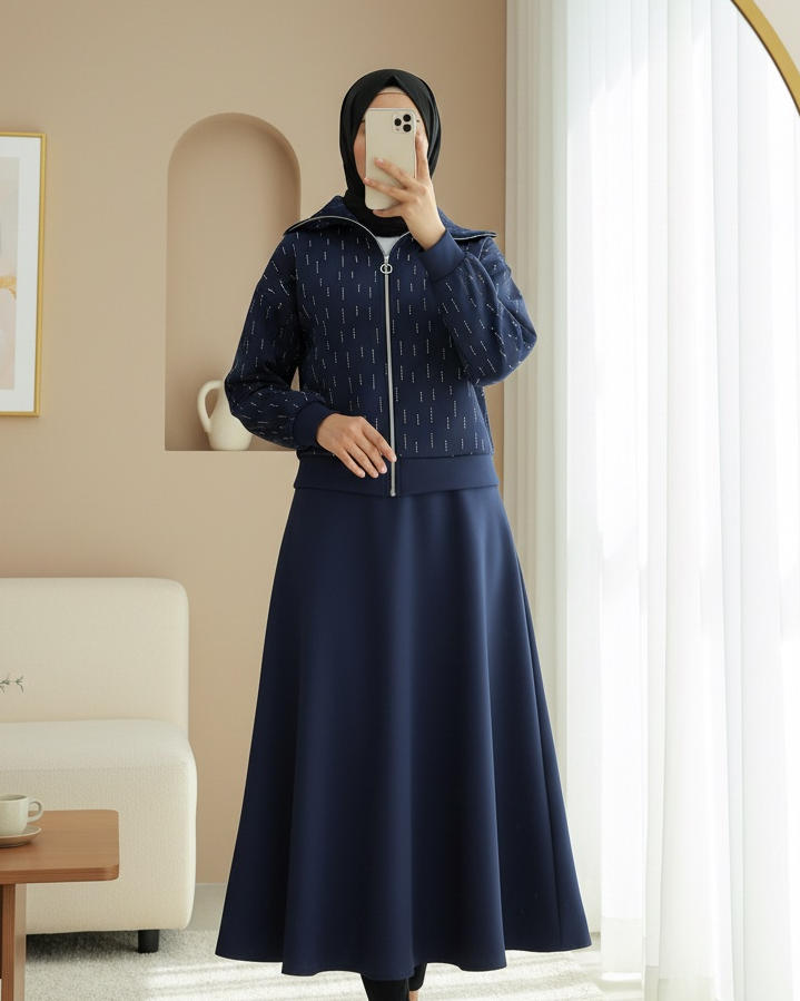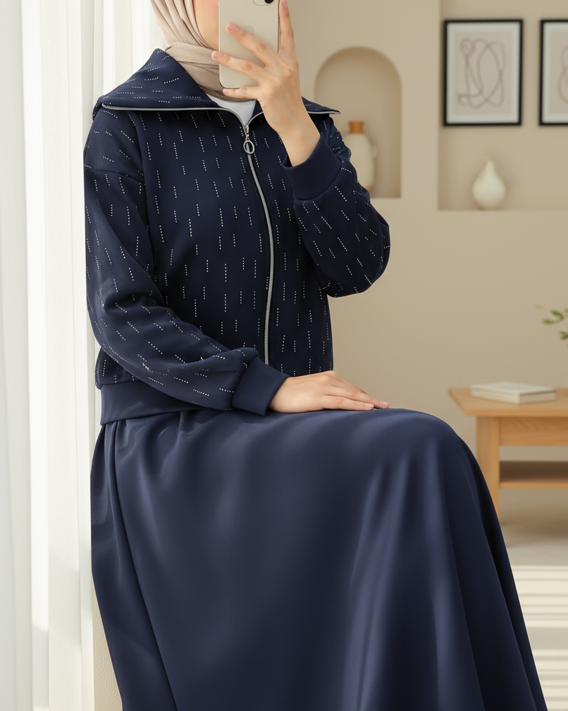 Önü Fermuarlı Boğazlı Taş Detaylı Scuba Takım -Laci-Lacivert