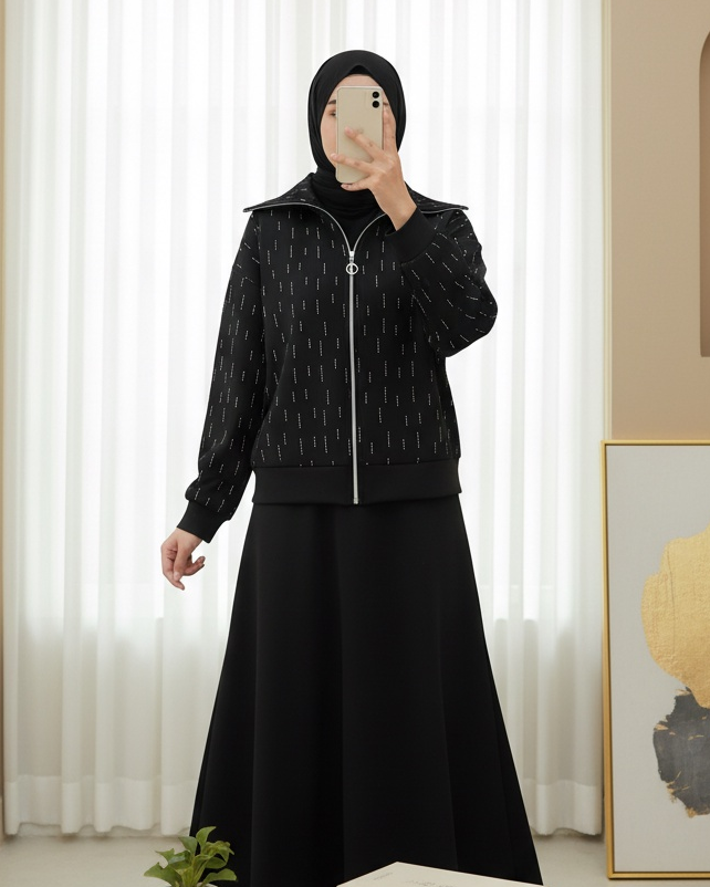 Önü Fermuarlı Boğazlı Taş Detaylı Scuba Takım -Siyah-siyah