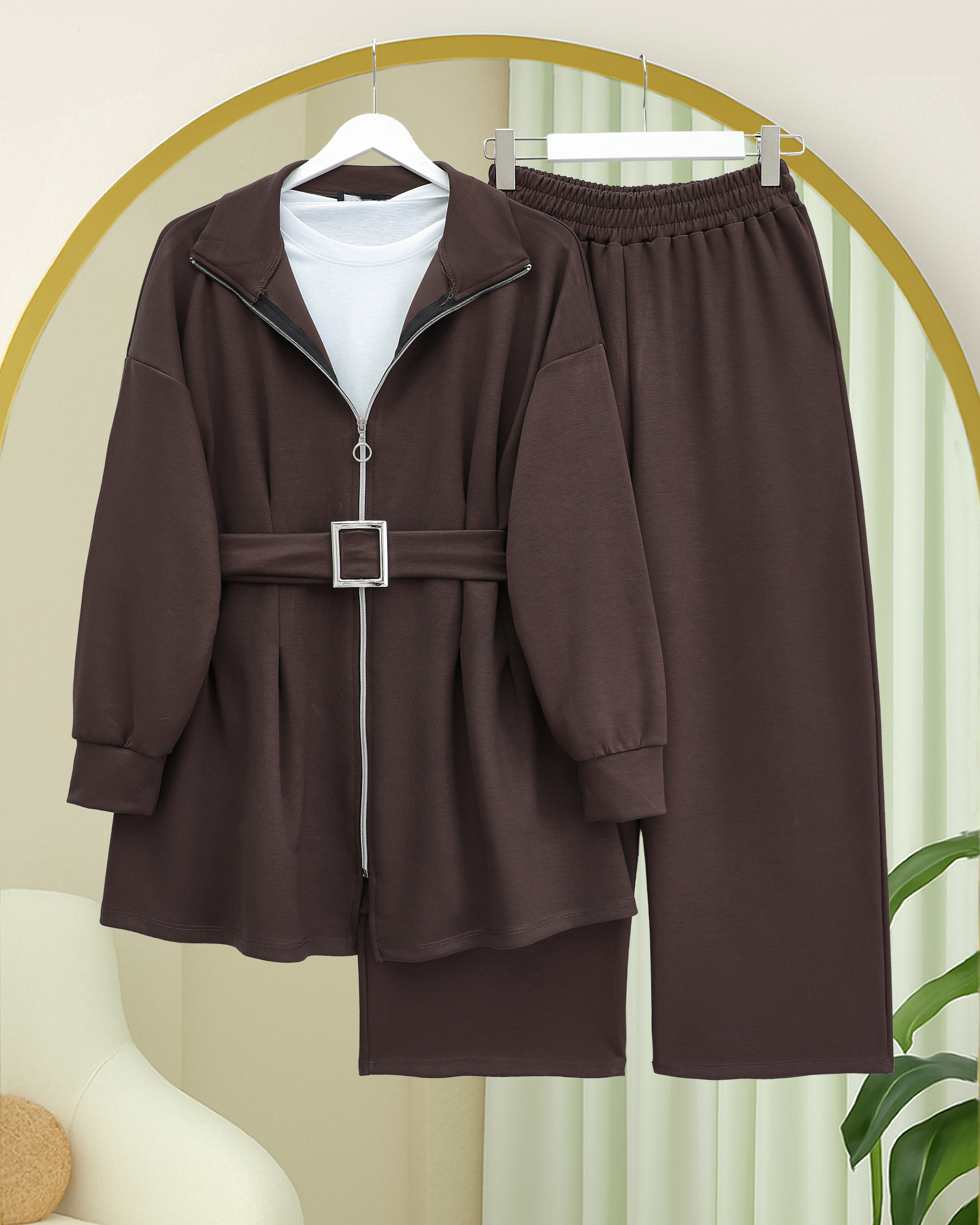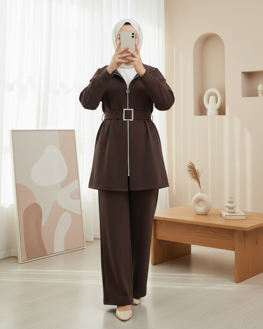 Önü Fermuarlı Kat Detaylı Oysho Takım -Kahve-Kahve