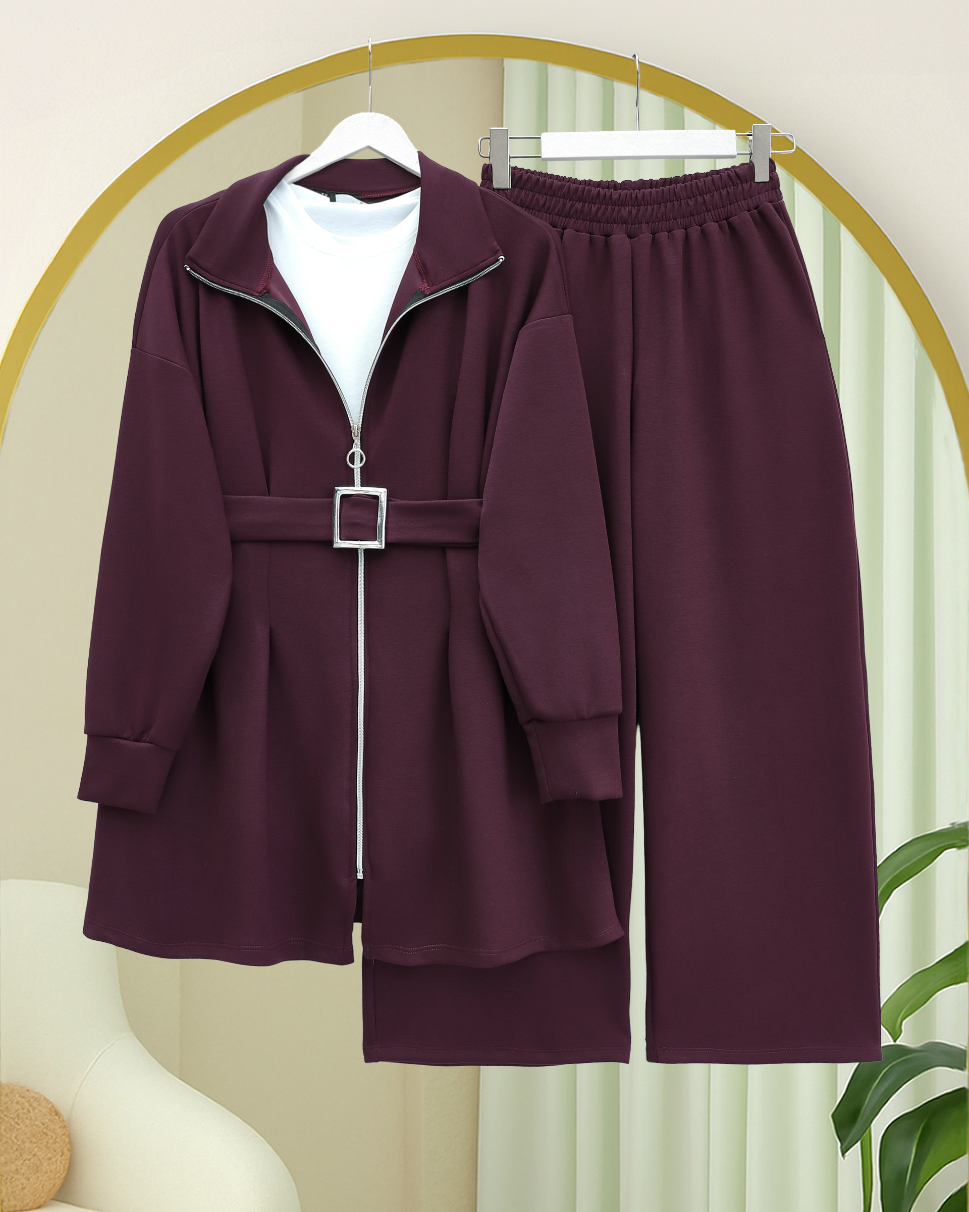 Önü Fermuarlı Kat Detaylı Oysho Takım -Mürdüm-Mürdüm