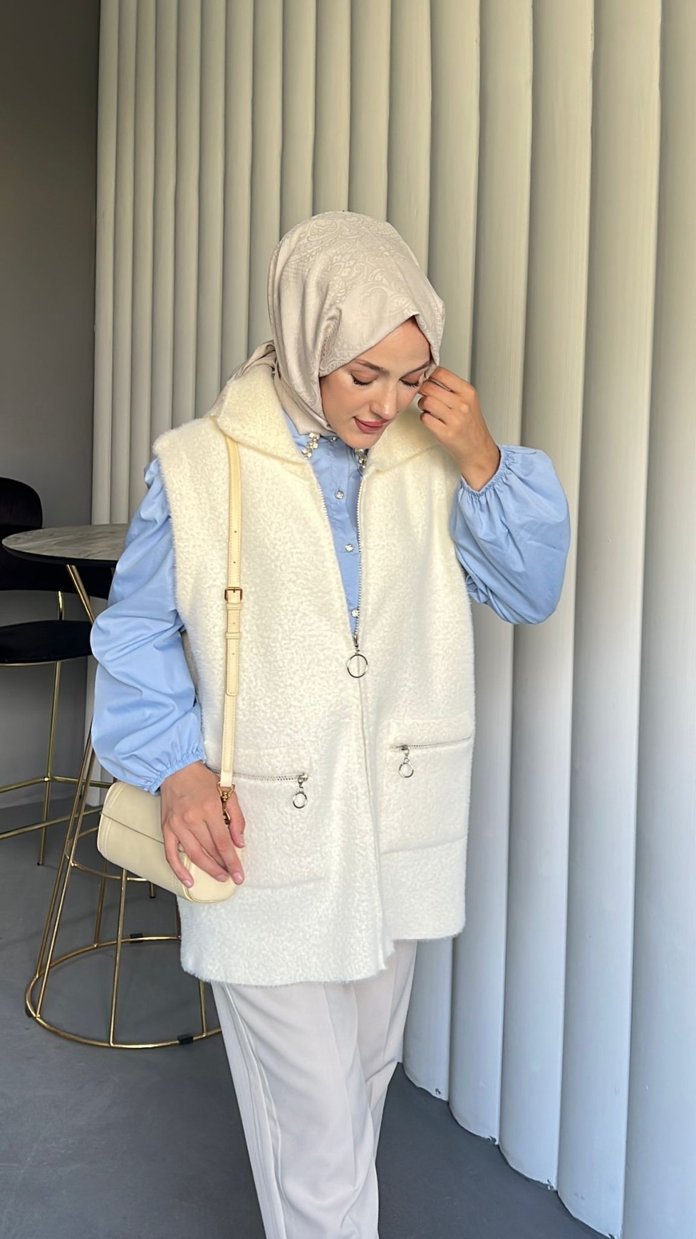 Önü Fermuarlı Torba Cepli Sakallı Yelek -Beyaz-Beyaz