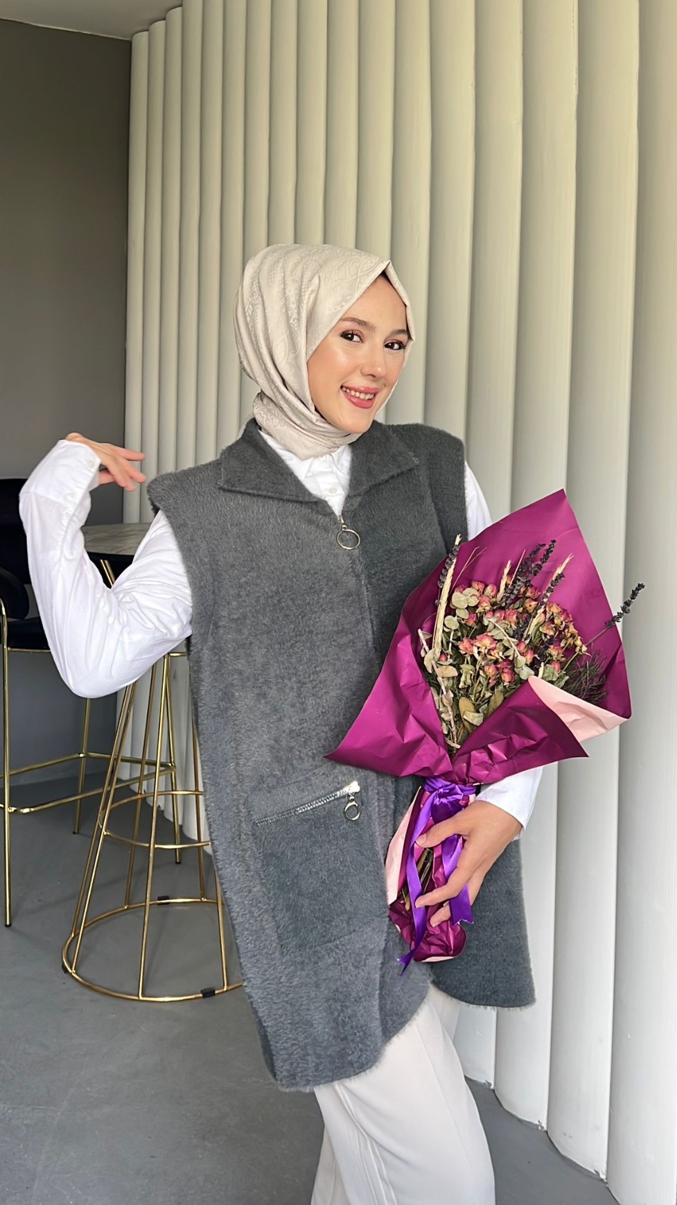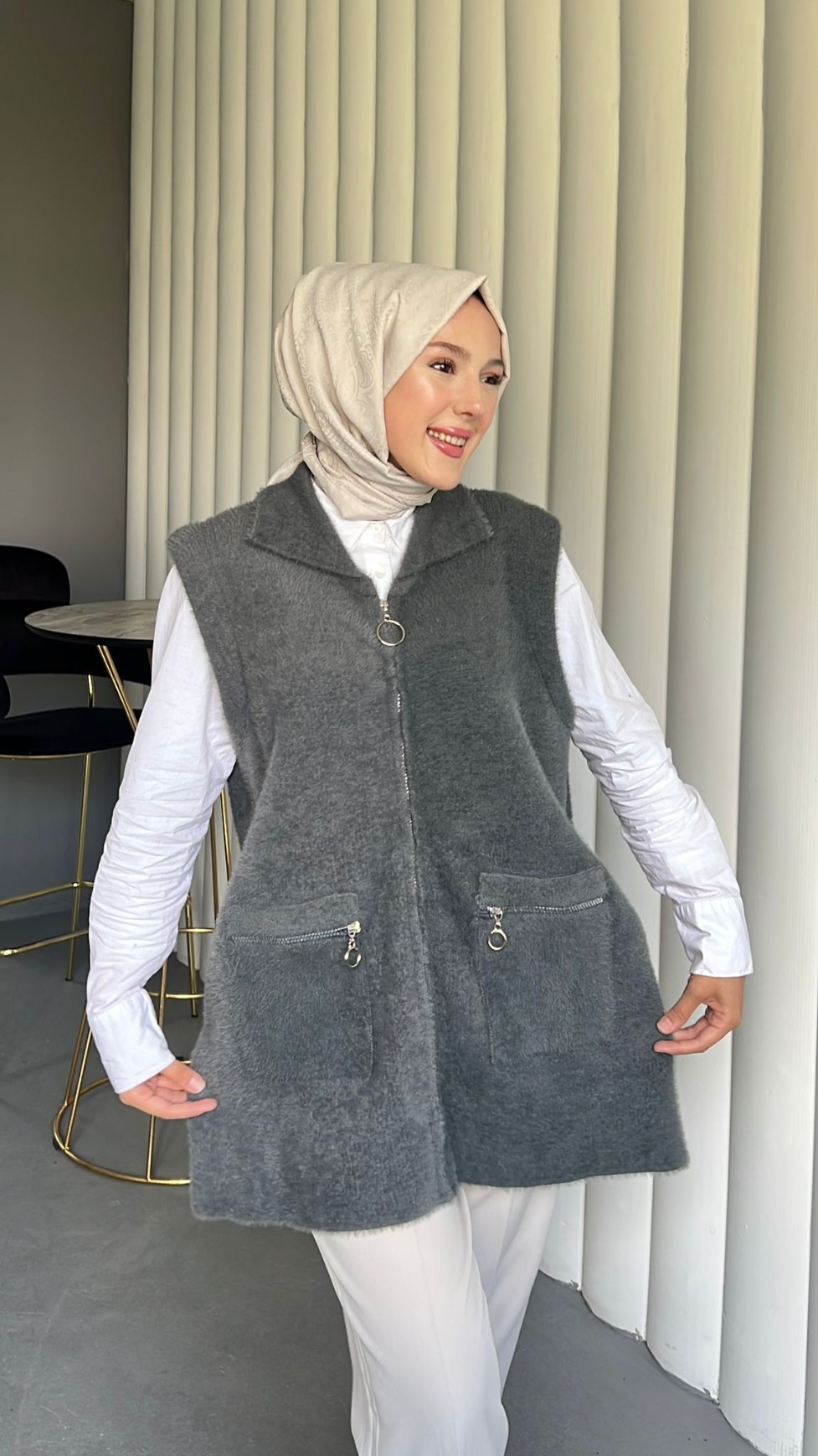Önü Fermuarlı Torba Cepli Sakallı Yelek -Füme-Füme