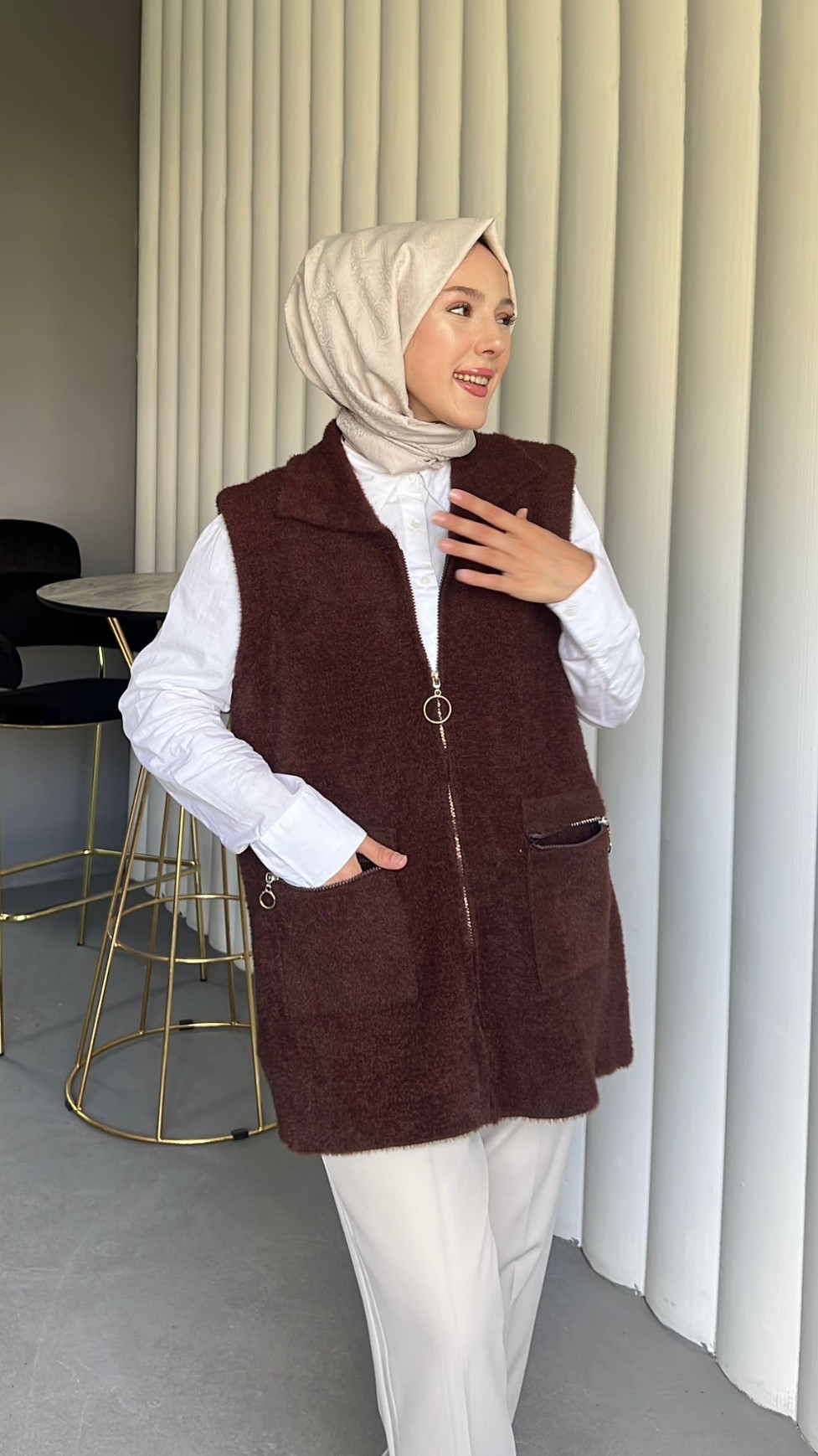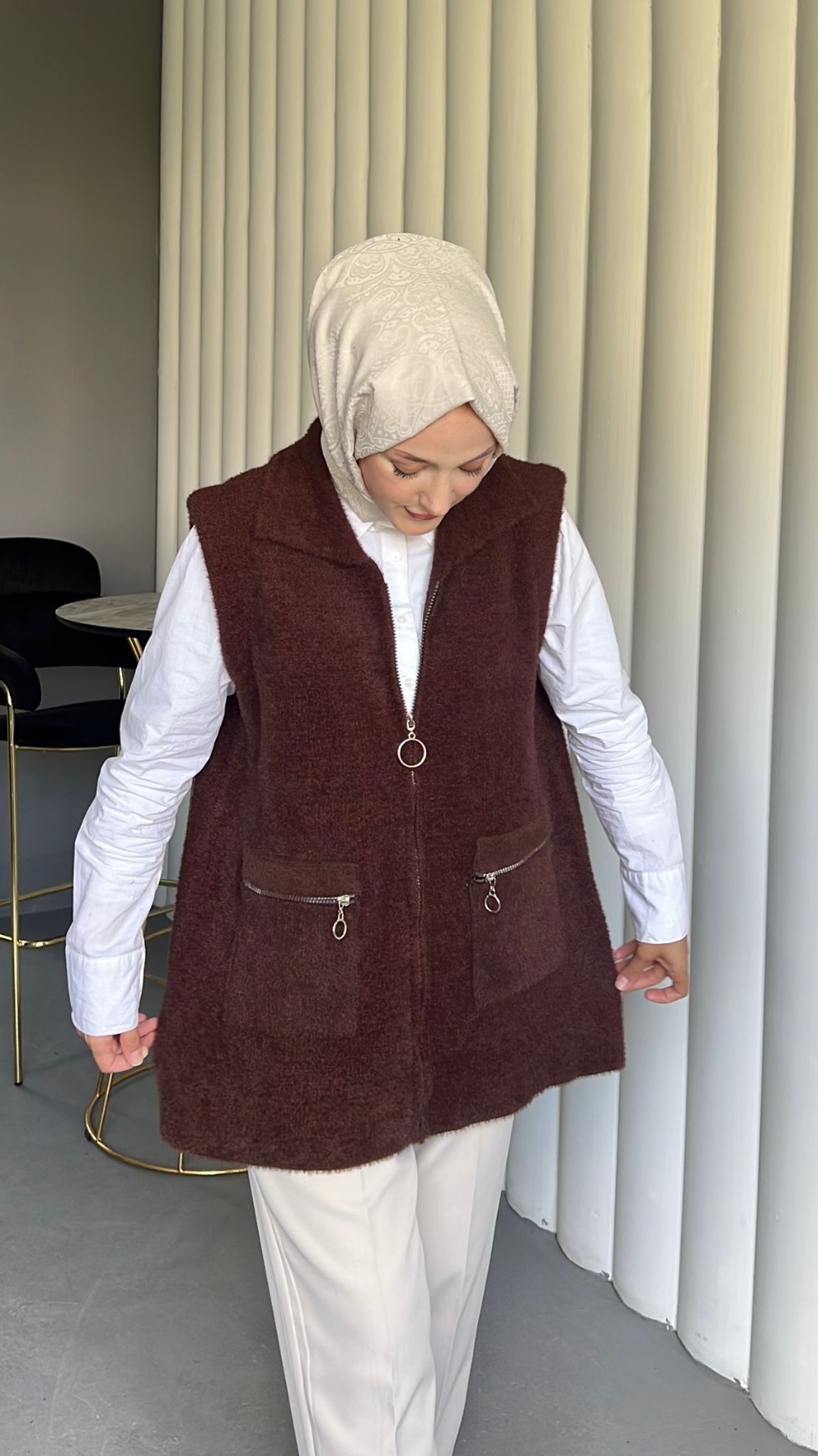 Önü Fermuarlı Torba Cepli Sakallı Yelek -Kahve-Kahve